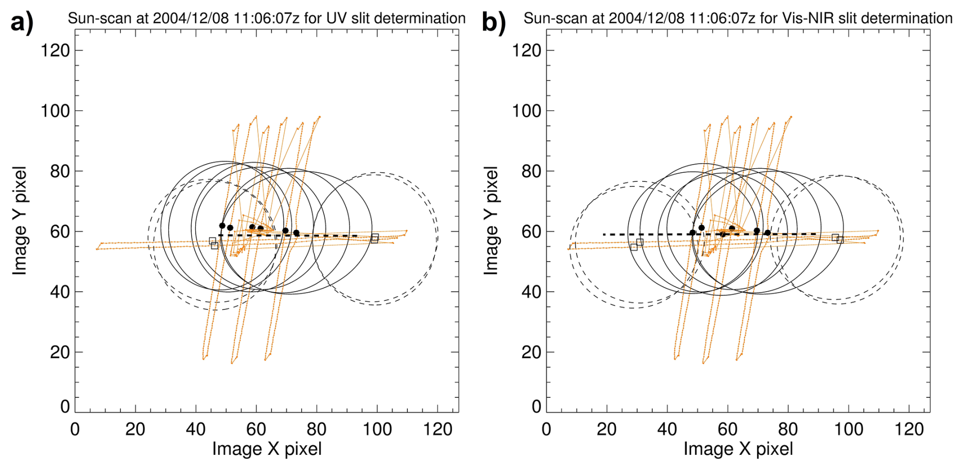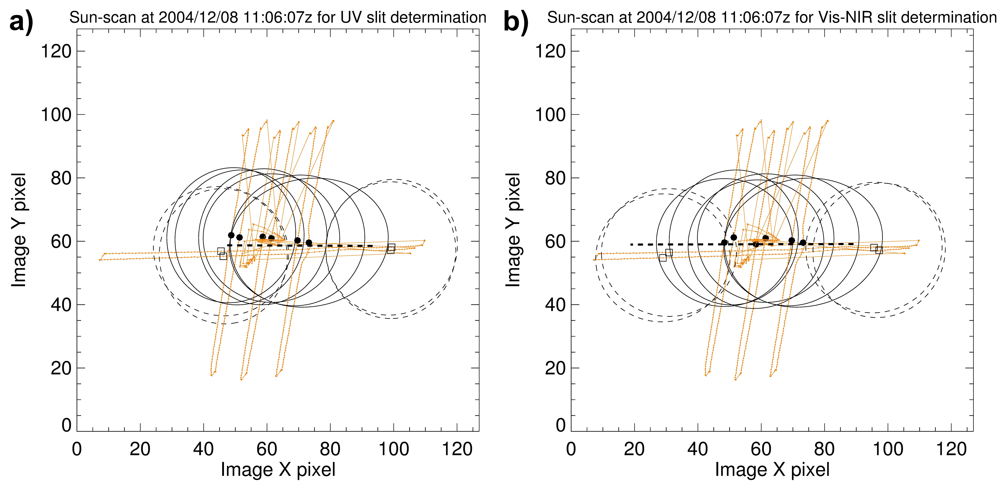 Figure 5The elevation and azimuth sun scans recorded on 8 December 2004 (orange solid straight lines) associated with the MAESTRO UV (a) and Visible-NIR (b) spectrometers. The sun centres (solid dots) and boundaries (solid ellipses) on the ACE NIR Imager are derived at the time when the UV and Visible-NIR slits cross the sun centre during elevation scans. During azimuth scans, the sun centres (open squares) and sun boundaries (dashed ellipses) are determined from the time of the half maxima of UV and Visible-NIR intensities. The dashed straight lines represent the positions of the UV and Visible-NIR slits estimated from the pre-flight test at DFL.