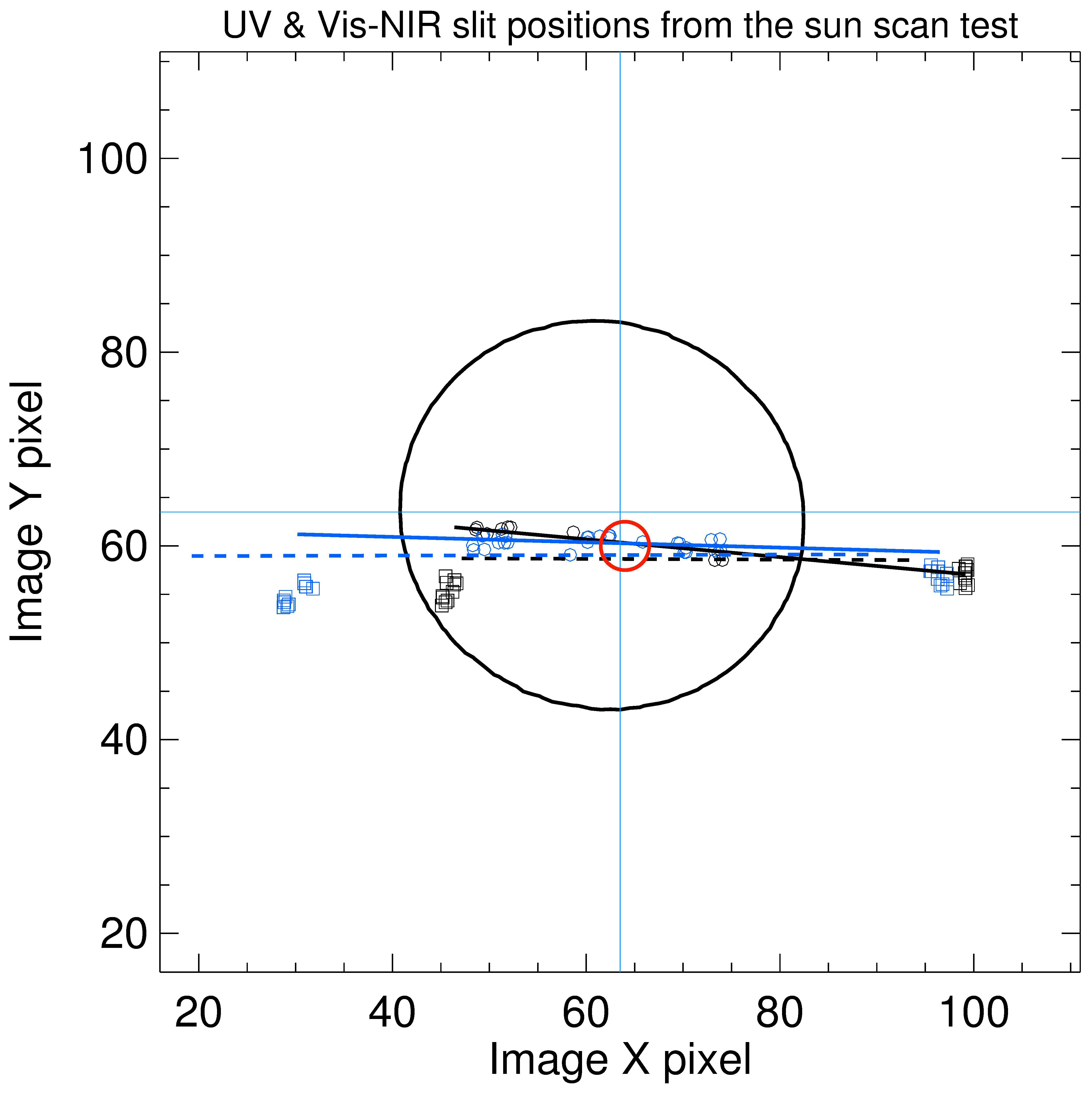 Figure 6The MAESTRO UV (solid black line) and Visible-NIR (solid blue line) slits estimated from six sets of sun scans recorded in December 2004. This plot is a 96 × 96 pixel image, cropped from the central part of the original 128 × 128 pixel image. The circles are the sun centres determined during the elevation scans for both UV (black) and Visible-NIR (blue) spectrometers. The squares represent the sun centres obtained from the azimuth scans for the UV (black) and Visible-NIR (blue) slits used to determine the edges of the slits. The UV (dashed black line) and Visible-NIR (dashed blue line) slits, as estimated from pre-launch tests at DFL, are shown. The red circle is the ACE-FTS FOV, as determined from an early commissioning test. The solid black circle denotes the position of the Sun's boundary.