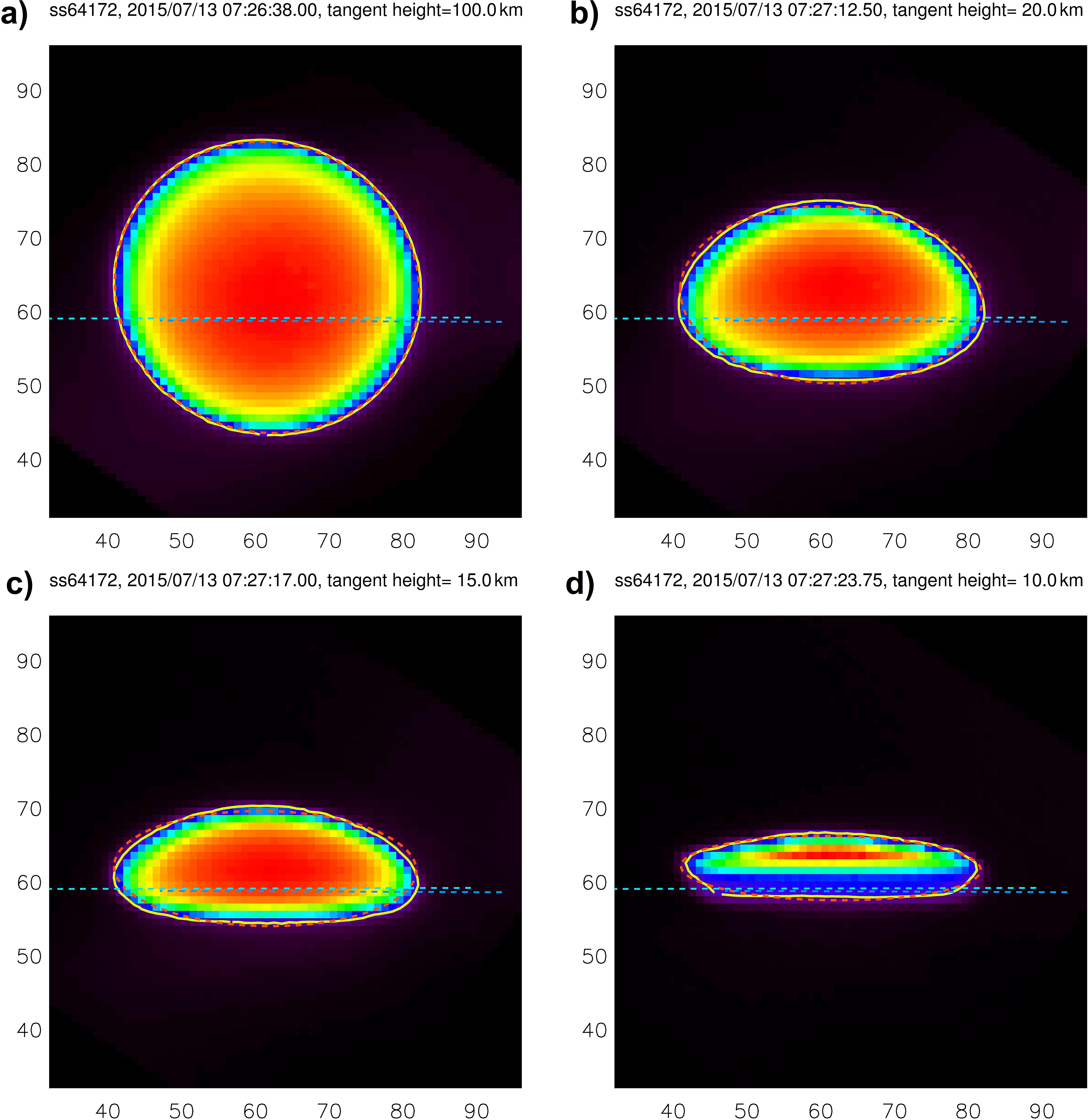 Figure 7Sun images for ss64172 captured by the ACE NIR Imager at tangent altitudes of 100 km (a), 20 km (b), 15 km (c), and 10 km (d) for ss64172. The yellow contour represents 15 % of the peak intensity, marking the Sun's boundary, and is fitted with an ellipse (red). The UV (blue dashed line) and Visible-NIR (light blue dashed line) slits, obtained from the pre-launch DFL test (Fig. 6), are superimposed.