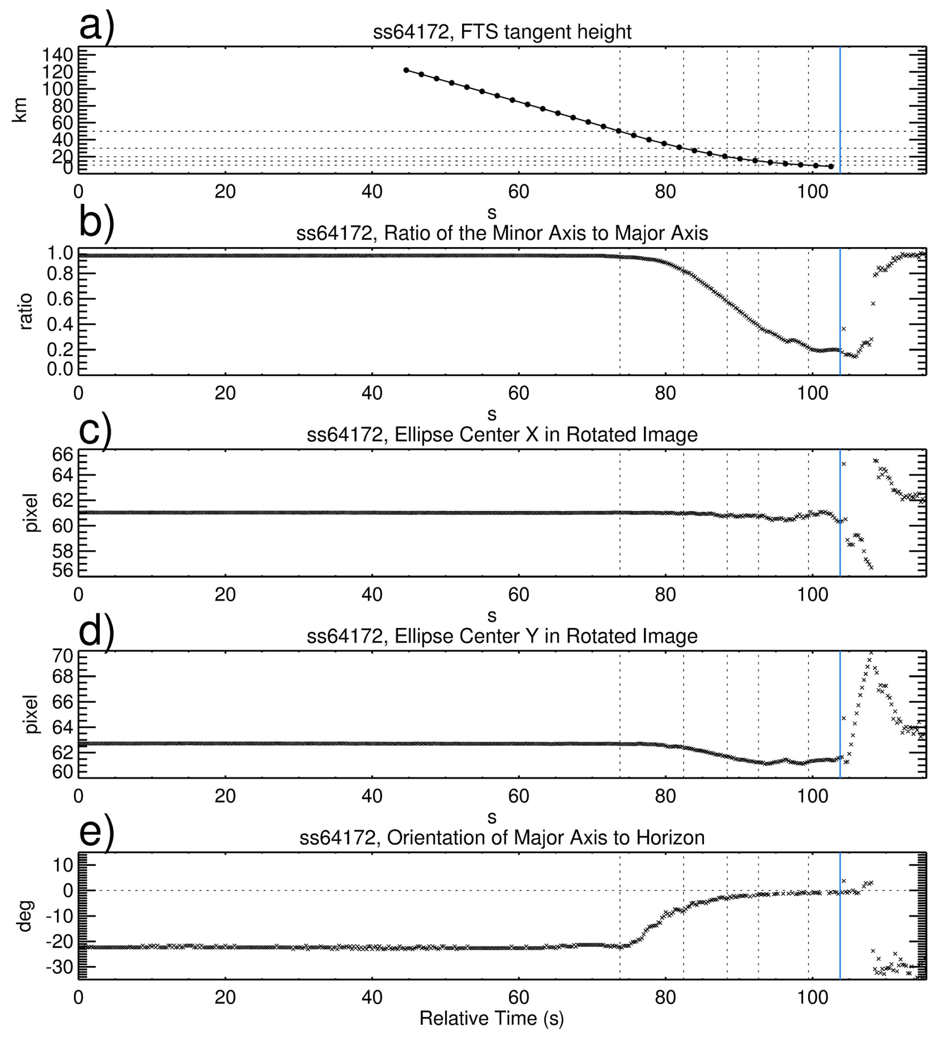 Figure 8The ACE-FTS tangent height vs. time curve for ss64172 (a). Time sequences of the ratio of the minor to major axes (b), the sun centre's X- and Y-coordinates in the images (c, d), and the orientation angle of the major axis to the horizontal axis (e). Vertical dotted lines indicate the time of the ACE-FTS measurement tangent heights at 50, 30, 20, 15, and 10 km. The vertical blue lines indicate the time at a low altitude when the sun tracker is no longer locked on the Sun.