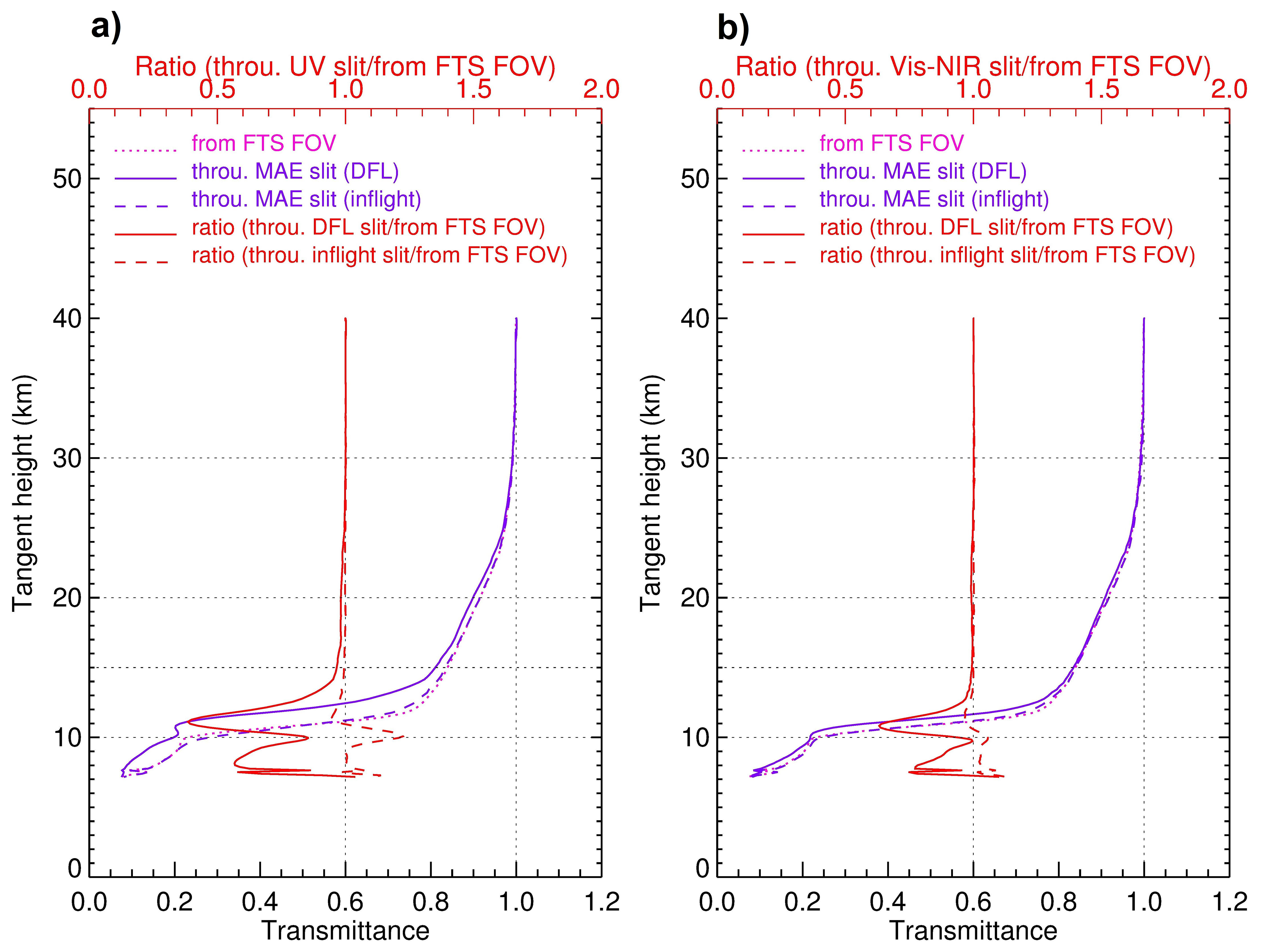 Figure 9The transmittance profiles below 40 km derived from the ACE NIR Imager integrated intensities alongside the MAESTRO UV (a) and Visible-NIR slits (b) estimated from the DFL test (solid blue) and from the in-flight sun-scan test (dashed blue), as well as the transmittance profile derived from the ACE NIR image intensities on the pixels where the ACE-FTS FOV is located (dotted pink). The two red curves are the ratios (top scales) of the DFL slit-position-derived transmittances (solid red) and the in-flight sun-scan test slit-position-derived transmittances (dashed red) to the ACE-FTS FOV-derived transmittances.