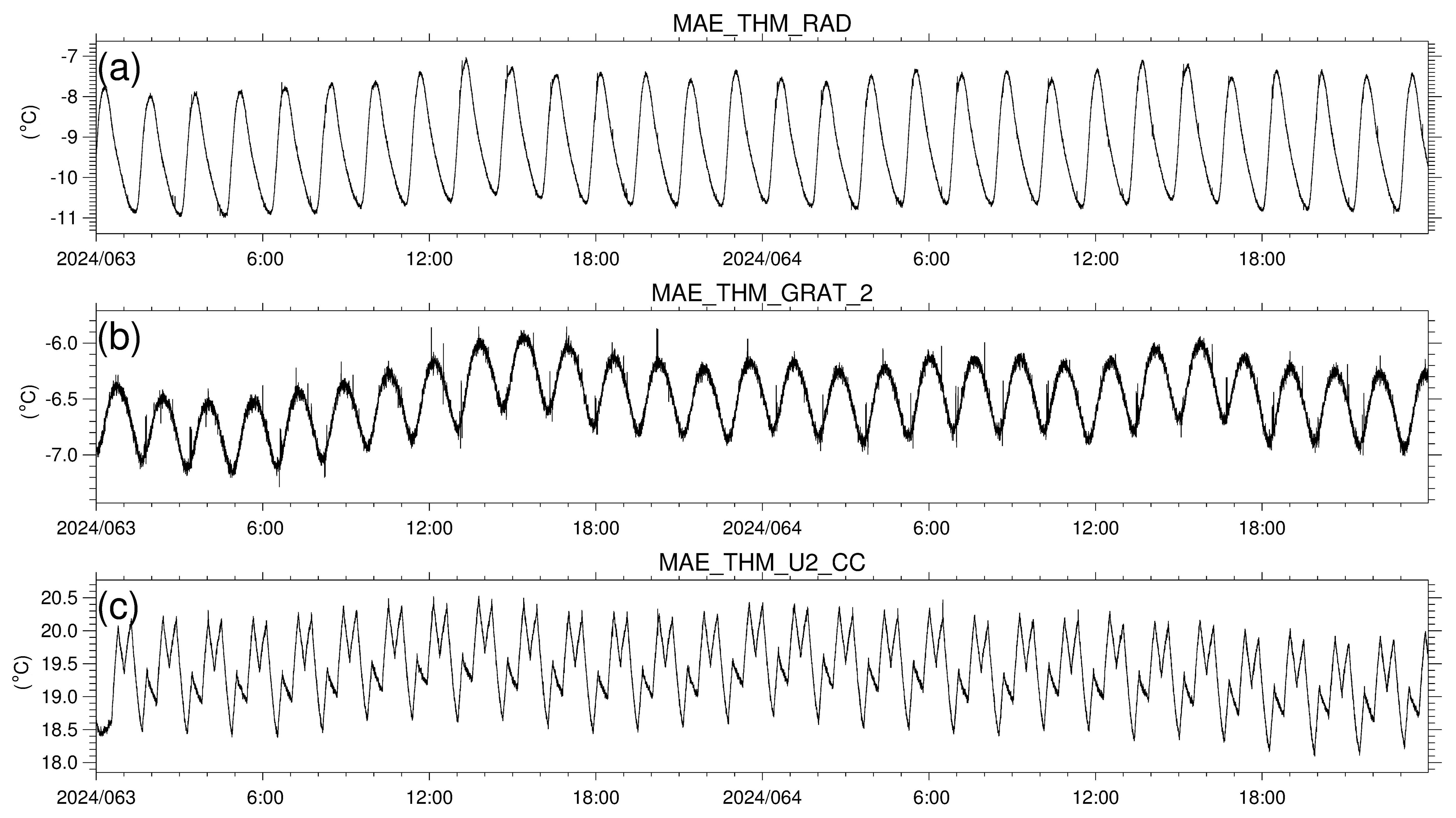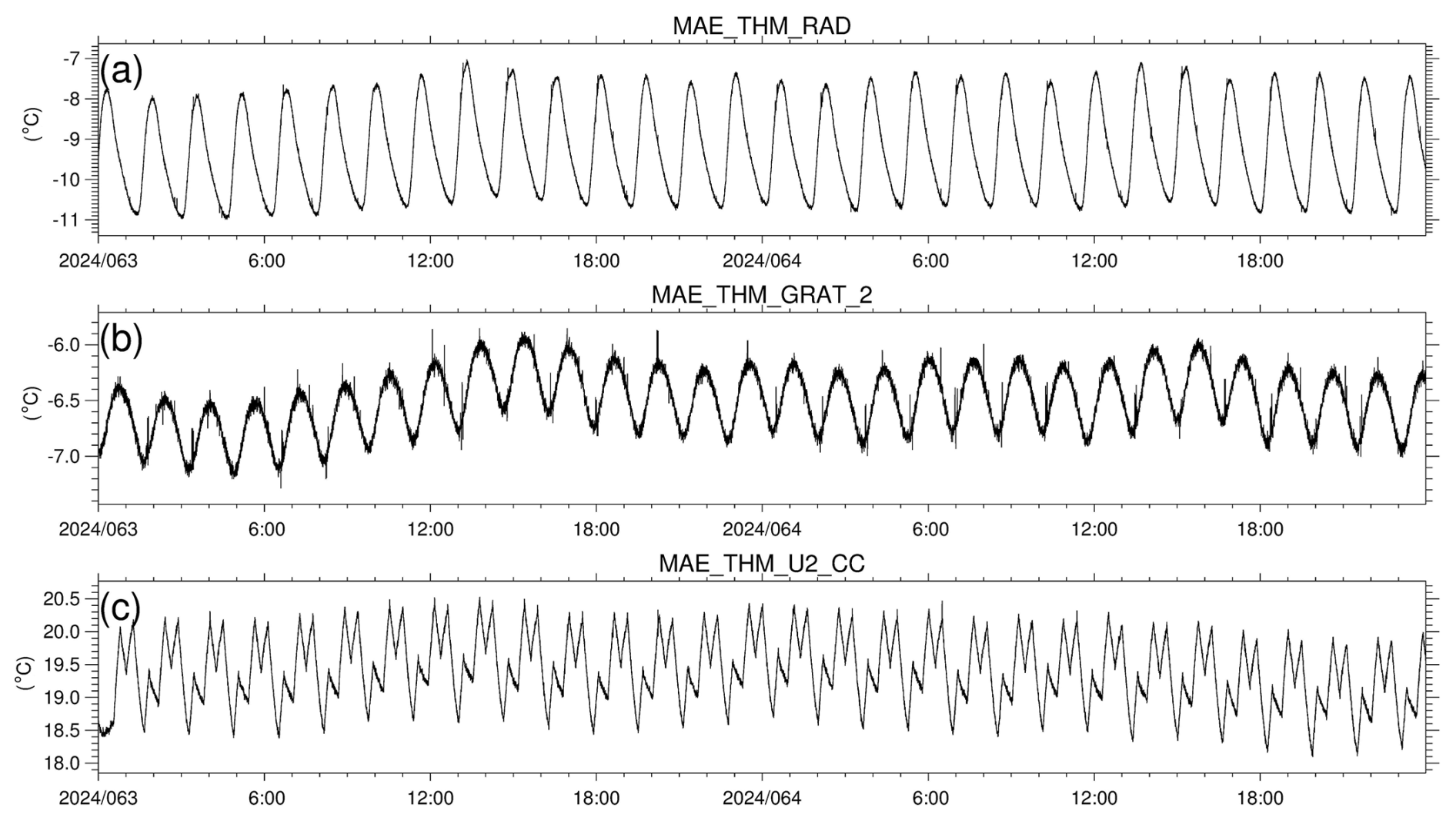 Figure 1048 h temperature (°C) for 3–4 March 2024 for the radiator (a), the grating for the Visible-NIR spectrometer (b), and the electronics board (c).