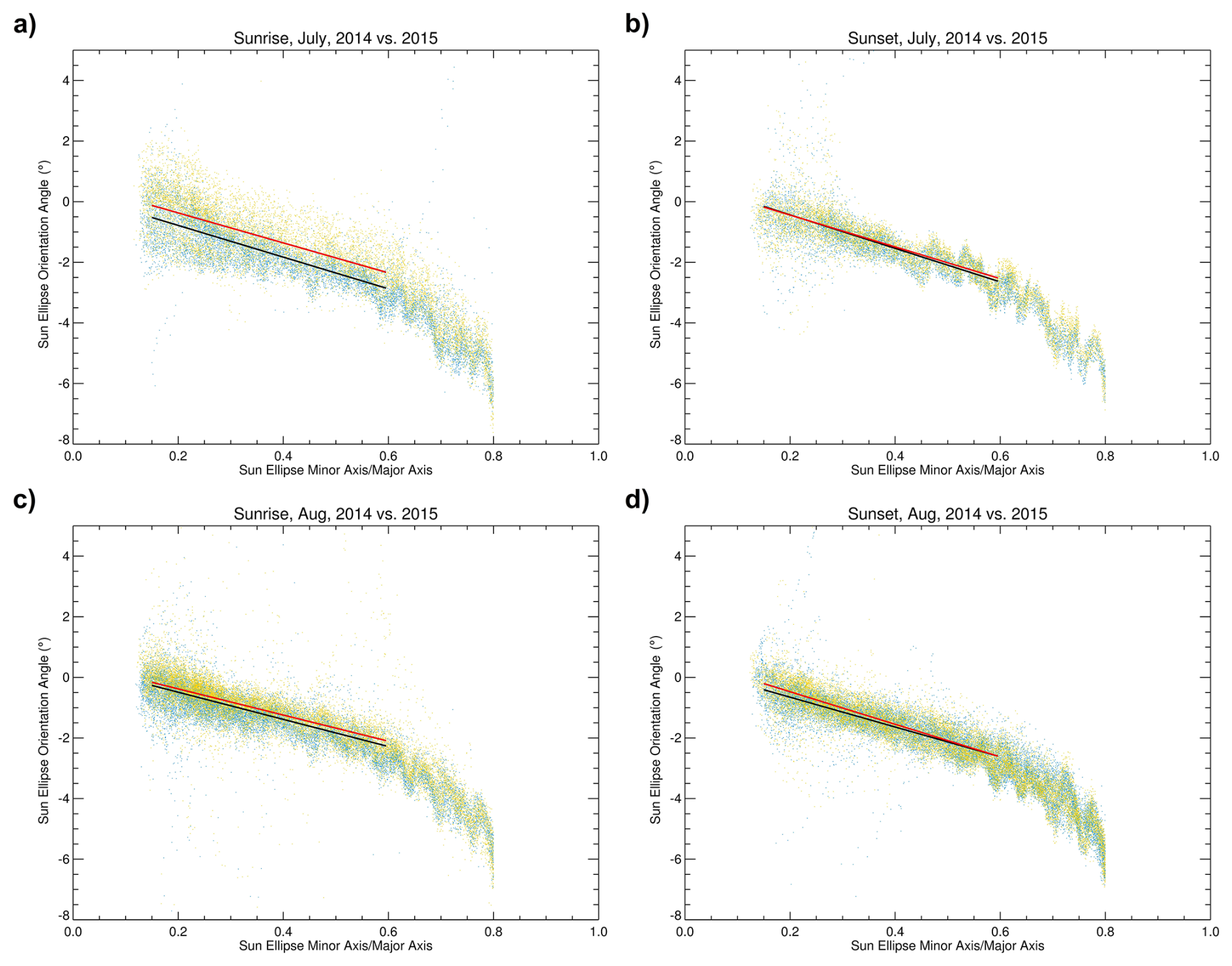 Figure 13Scatter plots showing the orientation angles of the major axis of the simulated sun and the ratios of the minor and major axes of the ellipse before the star tracker failure (2014, light blue dots) and after the failure (2015, orange dots) for July sunrise (a), July sunset (b), August sunrise (c) and August sunset (d) measurements. The black (2014) and red (2015) lines are the linear fits for the 2014 and 2015 data points within the 0.15–0.6 ratio range. The plots were cut off below 0.15 due to the sun tracker losing its lock on the Sun at low altitudes, and above 0.8, as the images are almost circular. ACE NIR Imager data from July have fewer data points than those from August, as the ACE-FTS detector decontamination is typically performed in early July, and thus, no occultation measurements are made. Sporadic outliers mainly originate from images taken at low altitudes when the sun tracker fails to lock onto the sun, resulting in indeterminate data.