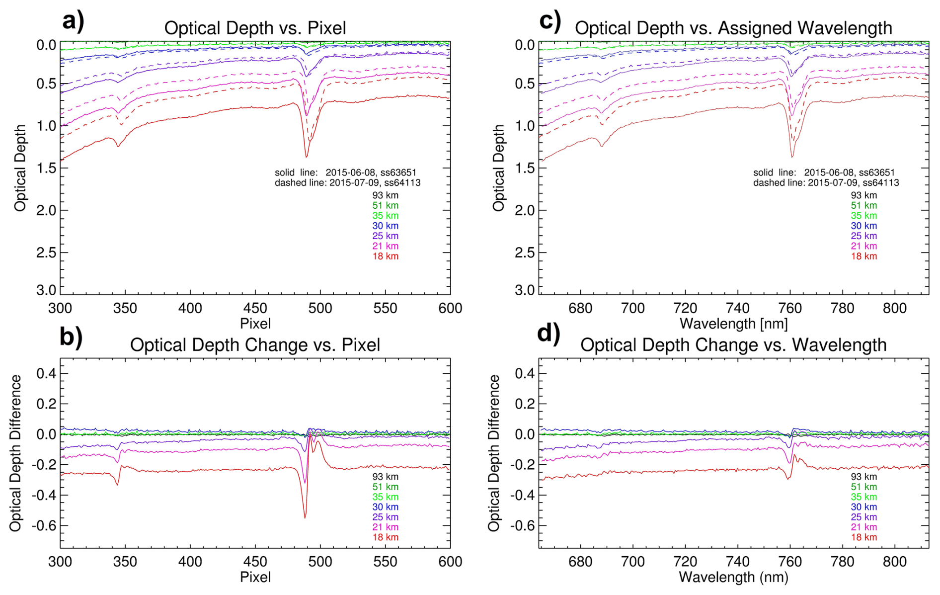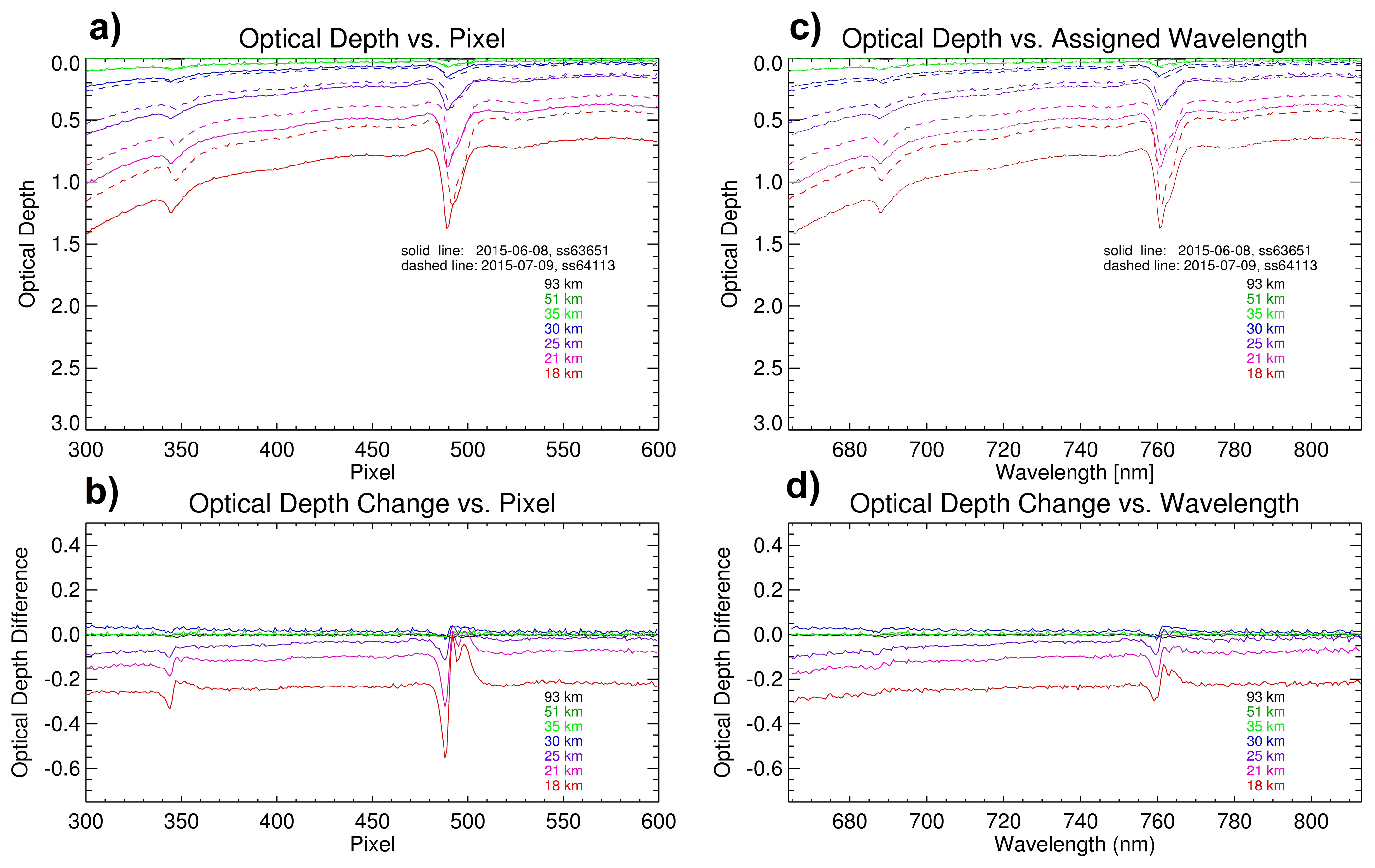 Figure 14The Visible-NIR optical depth spectra taken at several tangent heights (93, 51, 35, 30, 25, 21, and 18 km) during sunset occultation ss63651 on 8 June 2015 before the star tracker failure (solid) and during ss64113 on 9 July 2015 after the star tracker failure (dashed) as a function of pixel number (a) and their differences (b). The same spectra but with assigned wavelengths (c) and their differences (d).