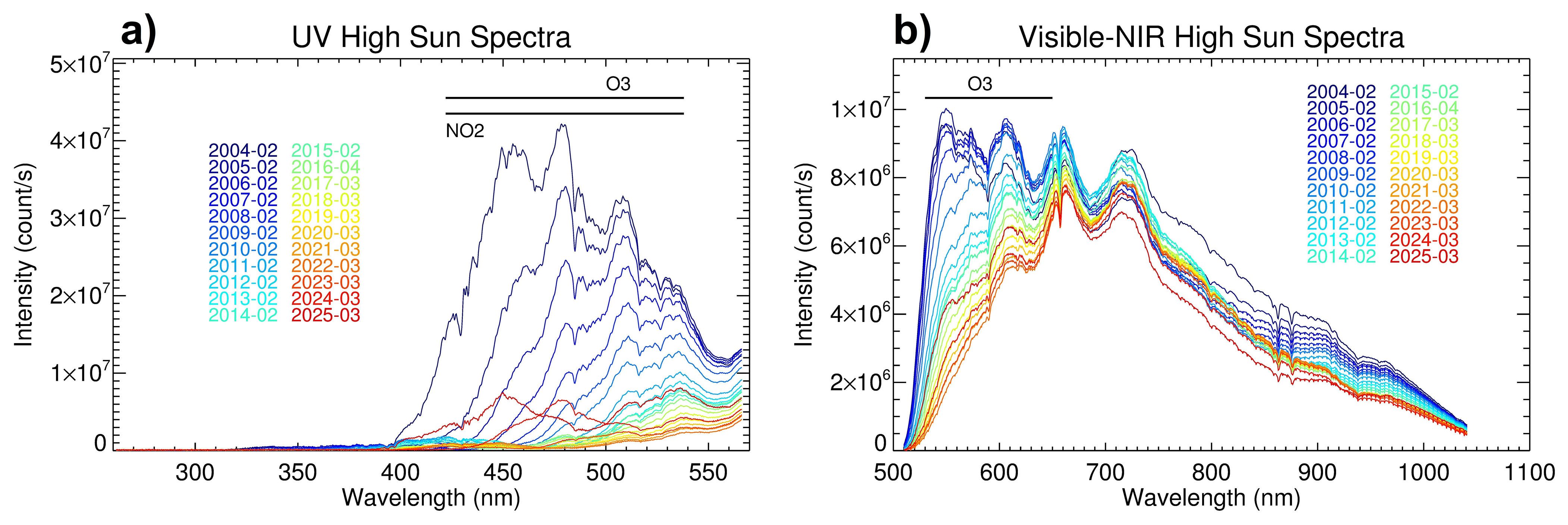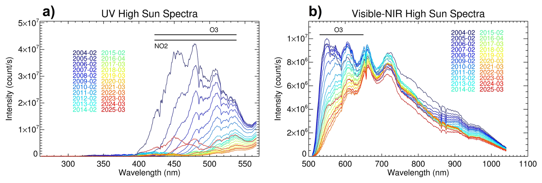 Figure 15A series of reference exo-atmospheric spectra obtained from the MAESTRO UV spectrometer (a) and the Visible-NIR spectrometer (b) covering 2004–2025, with one spectrum shown yearly. The relevant wavelength bands for the UV NO2, O3, and Visible-NIR O3 retrievals are indicated by horizontal lines near the top of the plots.