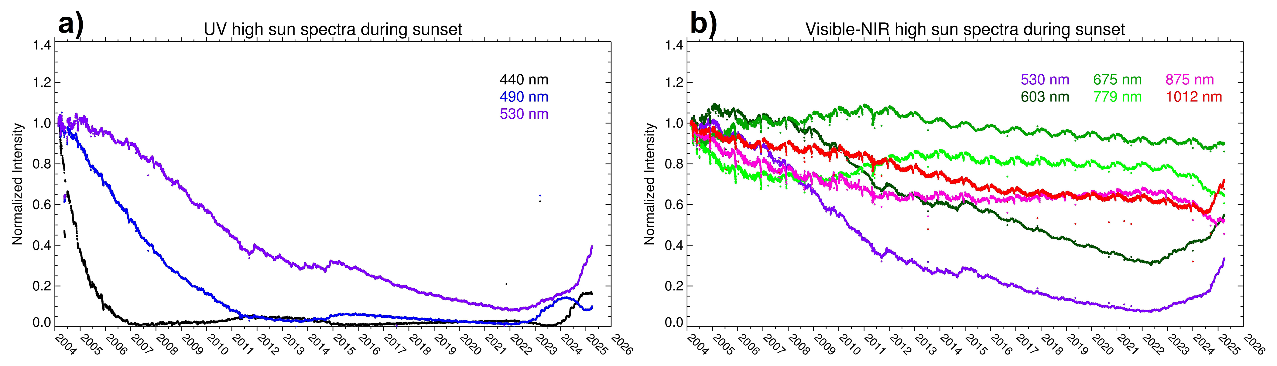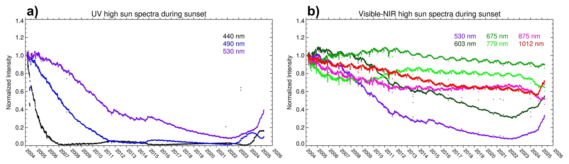 Figure 16Normalized time series of high sun spectral intensities between 2004–2025 from the UV spectrometer (a) and Visible-NIR spectrometer (b) at the wavelengths indicated by colour in the legends near the top of the plots.