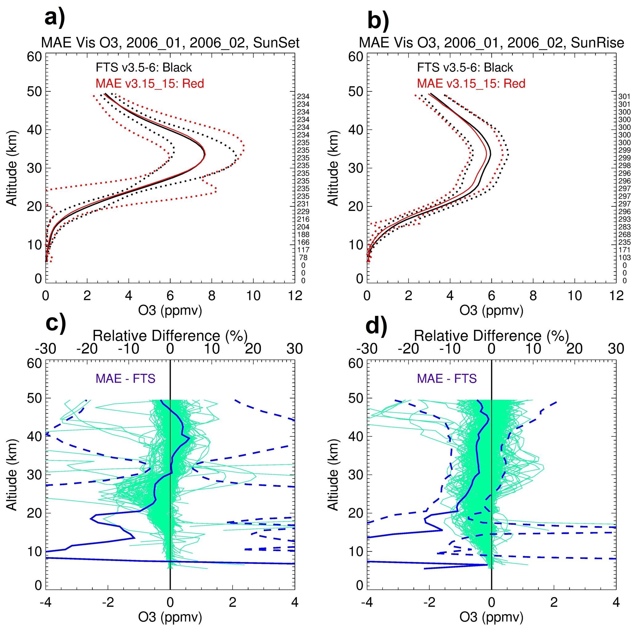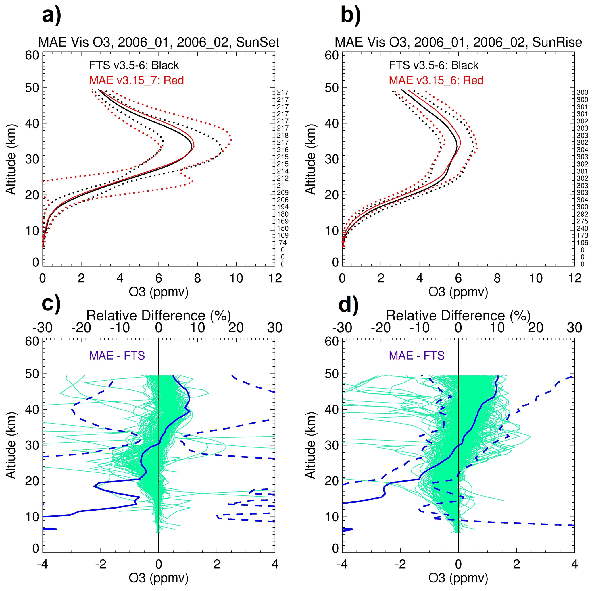 Figure 17The mean O3 profiles from MAESTRO (solid black) and ACE-FTS (solid red) averaged over January and February 2006, with a static time shift of −0.925 s, a fixed angle shift of −0.011° for both sunset (a) and sunrise (b) measurements along with their standard deviations (dotted black and dotted red lines). Absolute differences (MAESTRO – ACE-FTS, green lines; lower axes), the mean relative differences (solid blue; upper axes), and their standard deviations (dashed blue; upper axes) are shown for sunset (c) and for sunrise (d). The values along the right vertical axes in panels (a) and (b) show the number of data points compared at each altitude.