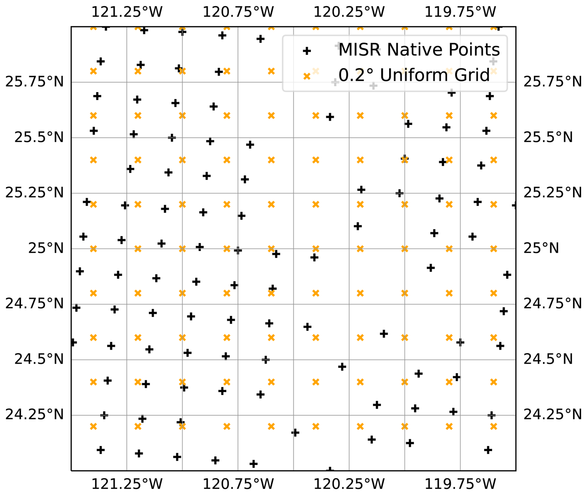 Figure 1A zoomed-in view of the spatial distribution of the native MISR data grid (black plus signs) and the grid centres of the uniform 0.2° grid to which all MISR data is resampled (orange crosses). Also shown are the windows used to calculate derivatives for the estimation of vertical air velocity (dashed red) and entrainment rate (dashed black) at cloud-top for a target grid-cell (blue circle).