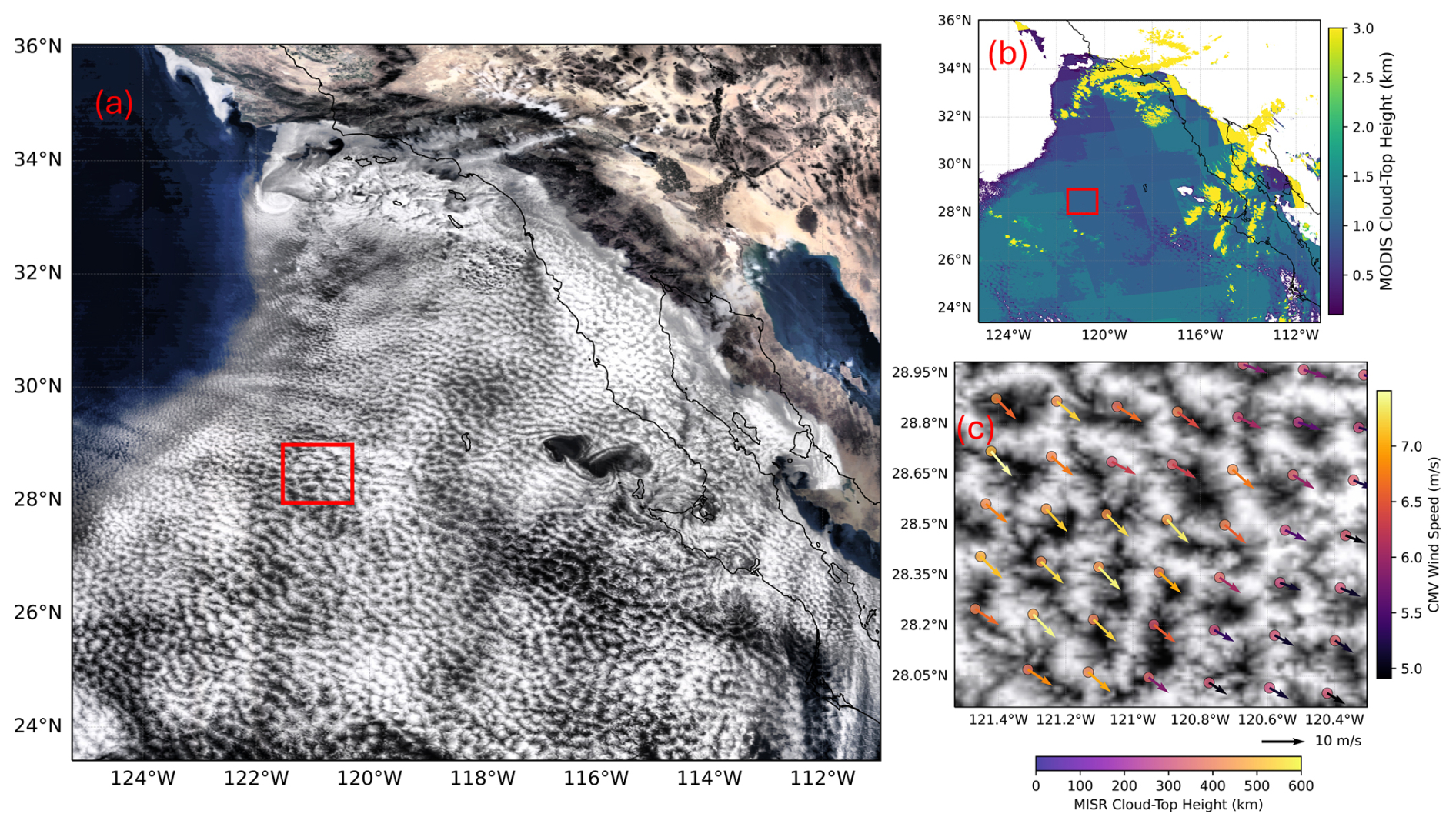 Figure 2(a) GOES visible channel reflectance (greyscale) and MISR CTH for low clouds (colours), (b) MISR CTH (blue-scale colours) and MISR cloud-motion vectors (red scaled coloured arrows) and (c) ERA5 PBL depths (blue-scale colours) and ERA5 horizontal wind vectors (red scaled coloured arrows).
