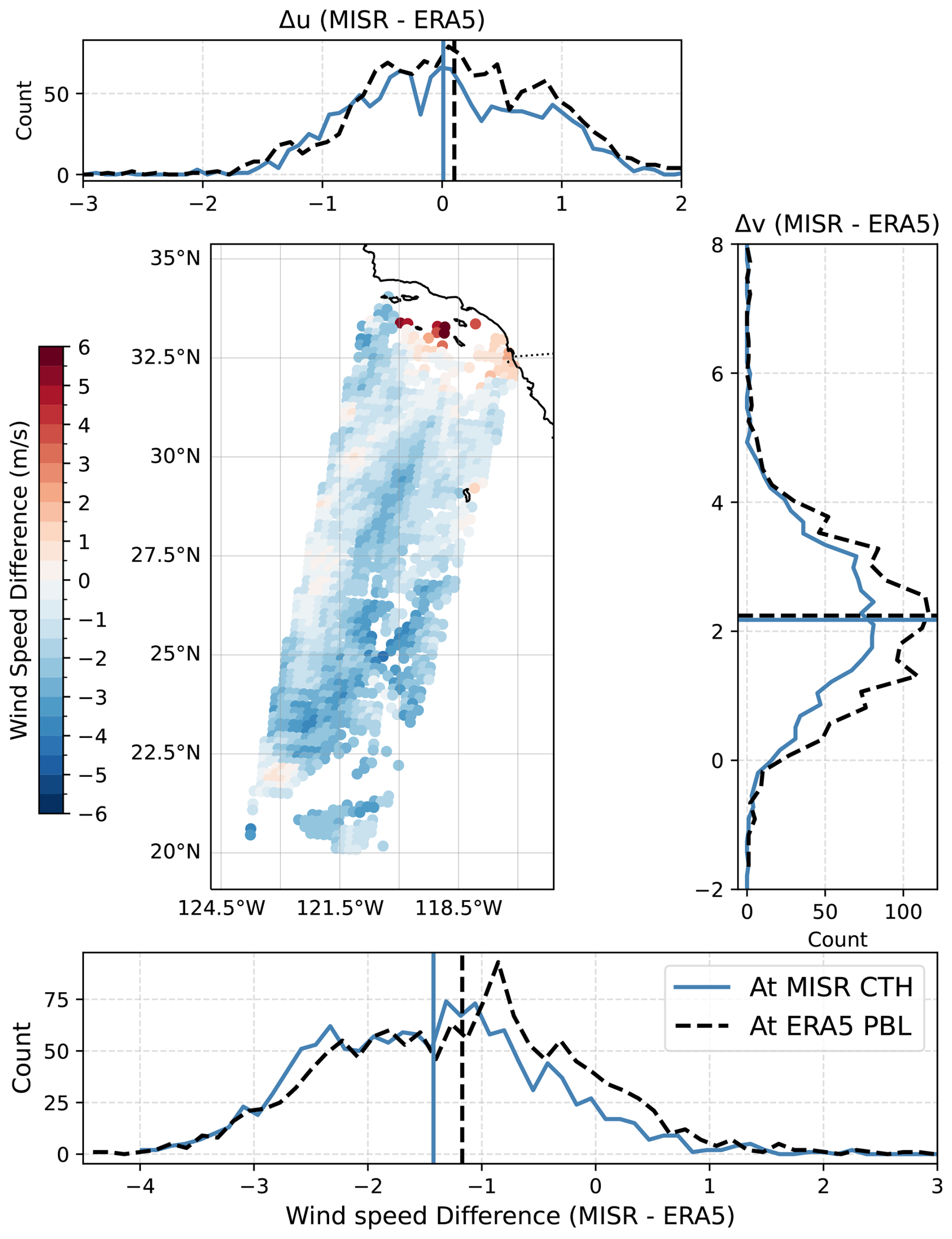 Figure 5(a) Differences between MISR and ERA5 wind speeds at MISR CTH. Histograms of the differences between MISR and ERA5 (b) u-component of wind velocity, (c) v-component of wind velocity and (d) wind speeds at MISR CTH (blue) and at ERA5 PBL top (dashed black). For the histograms in panels (b), (c) and (d), all units are m s−1 and the mean differences are denoted by vertical lines with the same style and colour of the corresponding histograms.