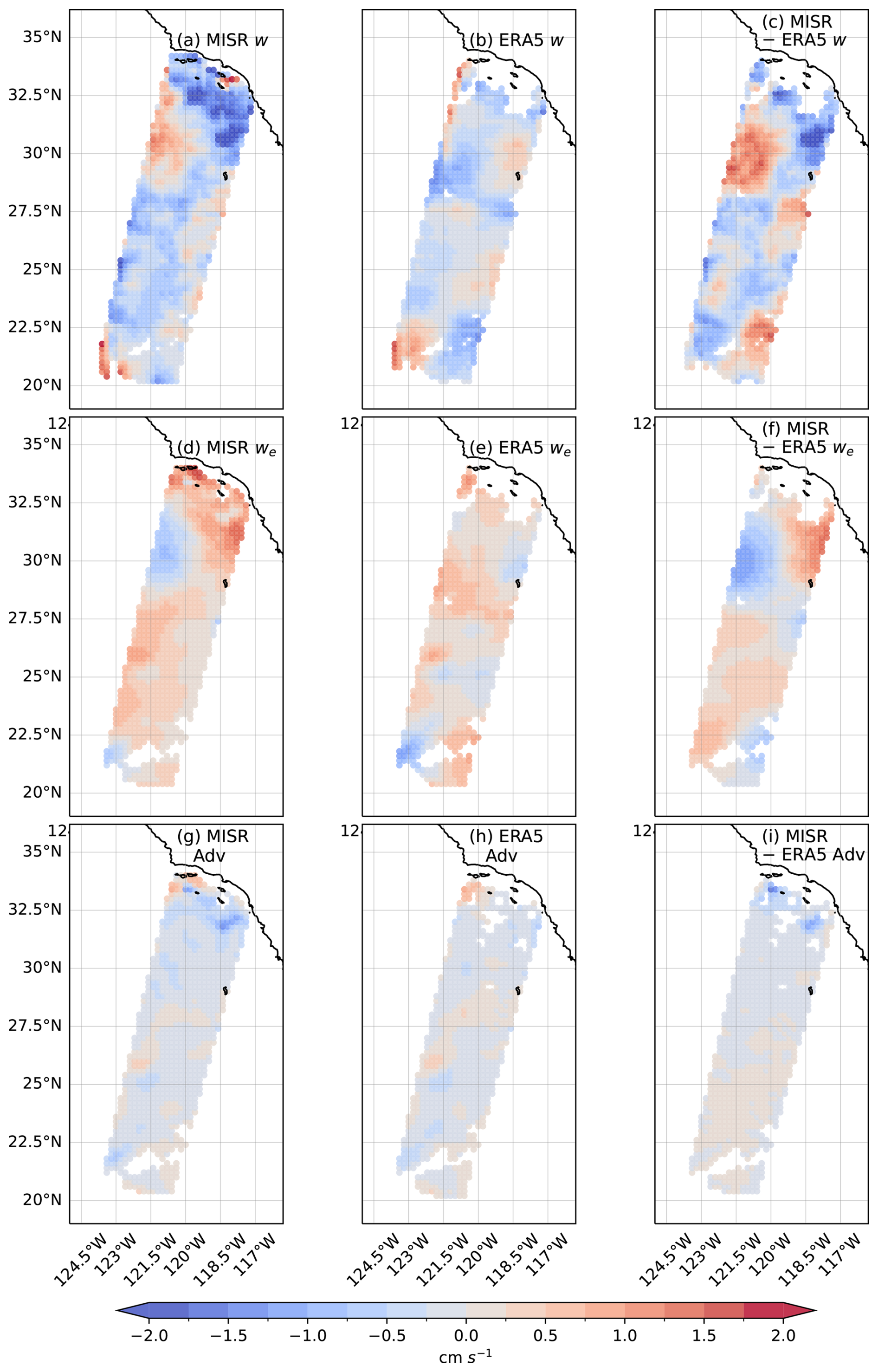 Figure 6(a) MISR w retrievals (b) ERA5 w (c) Differences between MISR and ERA5 w (d) MISR we retrievals (e) ERA5 we (f) Differences between MISR and ERA5 we (g) MISR CTH advective term (e) ERA5 PBL height advective term (f) Differences between MISR and ERA5 PBL advective terms.