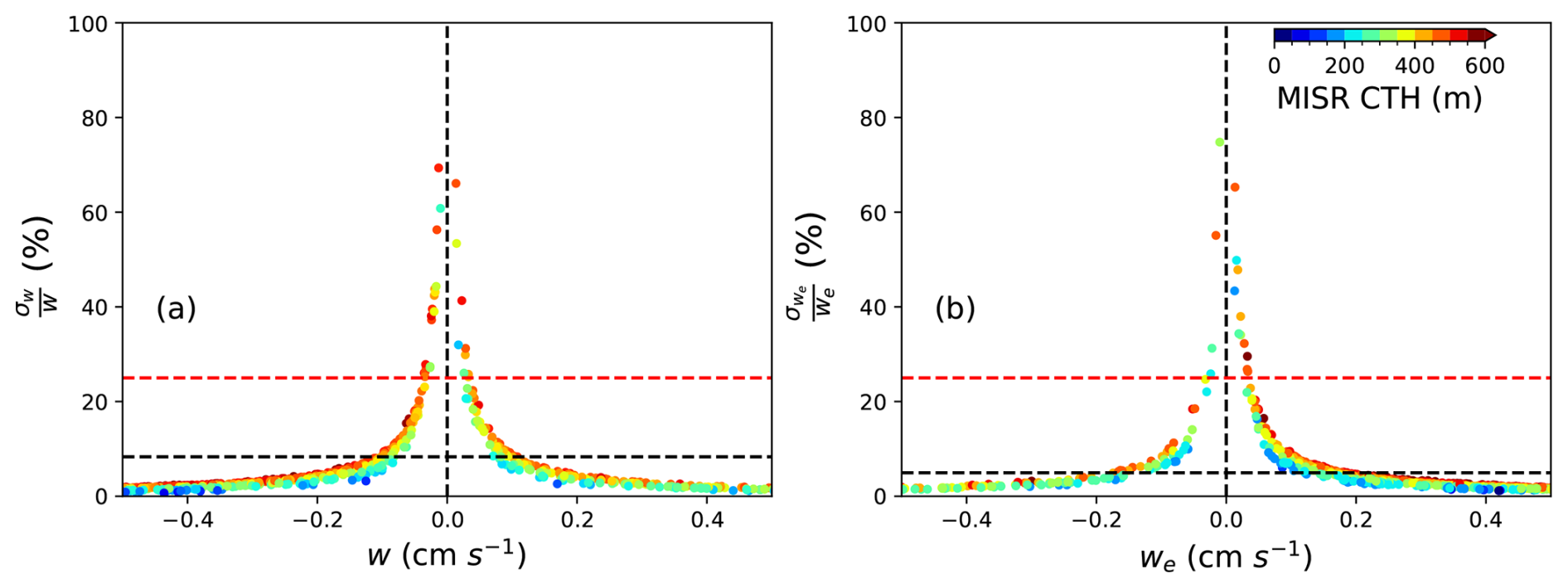 Figure 8(a) Pointwise fractional uncertainty of MISR-based retrievals of w (i.e., ) against the retrieved w. (b) Pointwise fractional uncertainty of MISR-based retrievals of we (i.e., ) against the retrieved we. For both panels, black dashed lines show the domain-mean fractional uncertainties; red dashed lines mark a 25 % benchmark. The sharp rise near w, we ∼ 0 reflects division by small magnitudes.