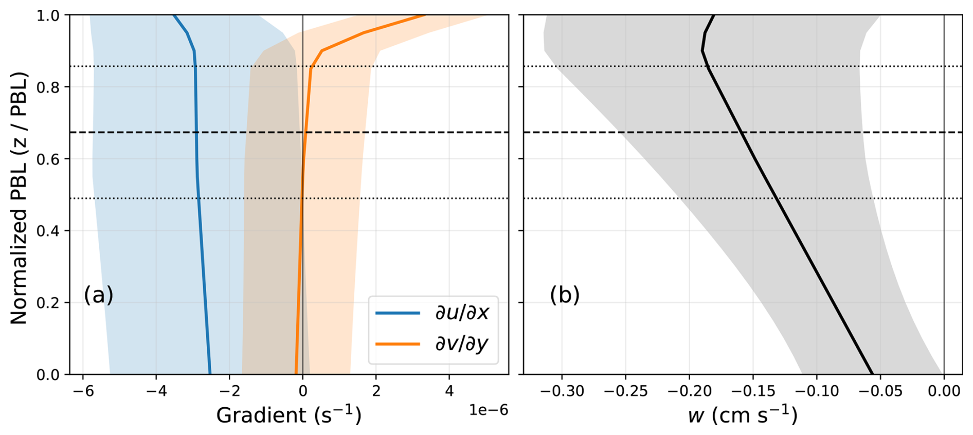 Figure A1ERA5 mean profiles on a normalized PBL coordinate () (a) Horizontal wind-gradient components (blue) and (orange); (b) vertical velocity w (black) (positive upward). Solid curves show the mean and shaded envelopes denote one standard deviation variability. Horizontal dashed lines show mean (thick) and standard deviation (thin) of MISR retrieved heights (transformed to the normalized PBL coordinate).