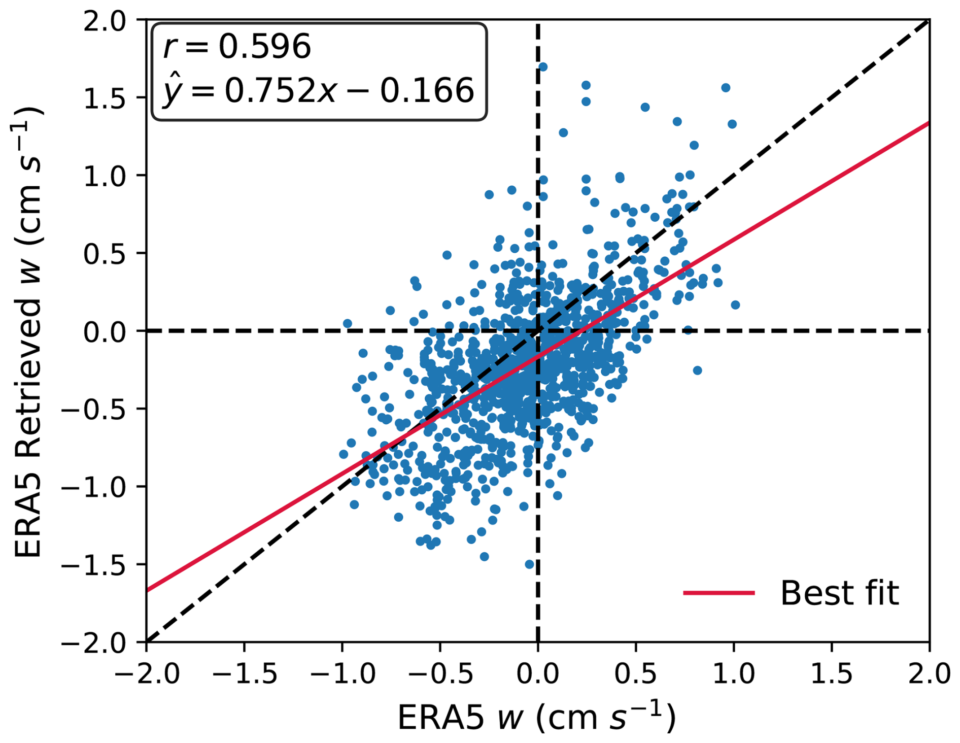 Figure A2Scatter comparison of ERA5 vertical velocity at PBL top against the continuity-based ERA5 retrieval (from horizontal wind divergence). Each marker is a co-located grid cell. The dashed black line is the 1:1 line; the solid red line is the least-squares fit (equation shown). The upper-left inset reports the Pearson correlation coefficient (r).