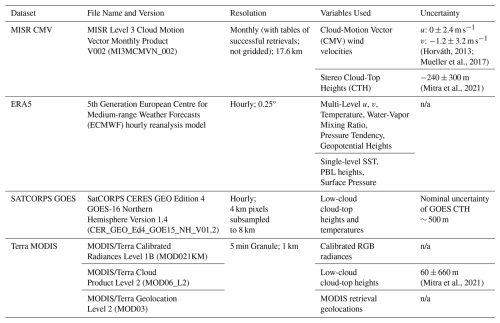 MISR CMV data are publicly available at the NASA Langley Atmospheric Science Data Center (https://doi.org/10.5067/Terra/MISR/MI3MCMVN_L3.002, NASA/LARC/SD/ASDC, 2012). ERA5 Reanalyzes are publicly available through the European Center for Medium-Range Weather Forecast (ECMWF) Climate Data Store (CDS) website (https://doi.org/10.24381/cds.bd0915c6, Copernicus Climate Change Service (C3S) Climate Data Store (CDS), 2023). SATCORPS GEO Edition 4 GOES NH data was accessed through searching on NASA's Earthdata website (https://search.earthdata.nasa.gov/search?q=SATCORPS GOES NH, last access: 1 September 2025). All MODIS data are publicly available through the Level 1 and Atmosphere Archive and Distribution System of NASA Goddard Space Flight Center (https://ladsweb.modaps.eosdis.nasa.gov/archive/allData/61/, last access: 1 September 2025).