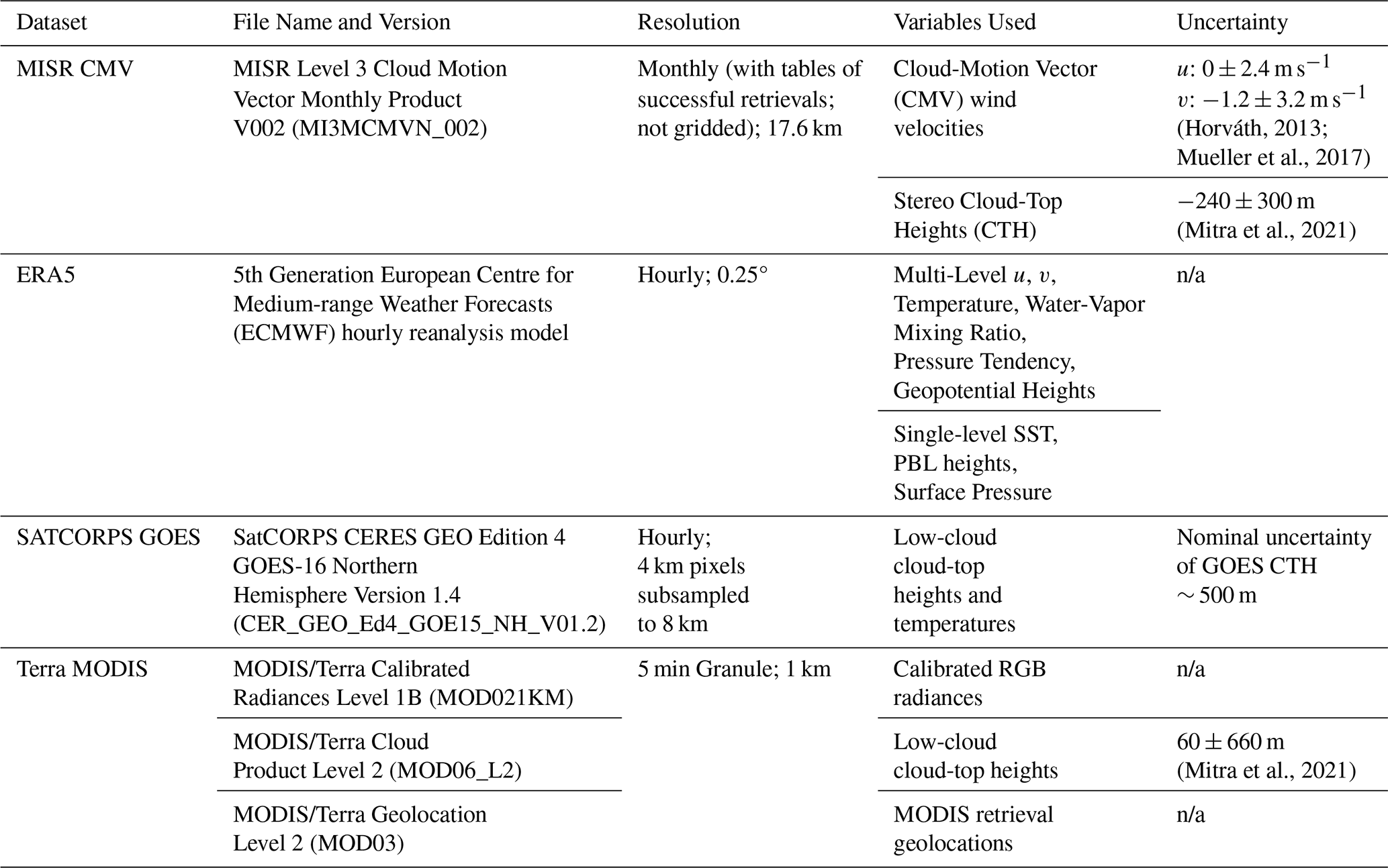 The proposed retrieval technique only utilizes data from MISR. Additional datasets are used for validation of MISR wind vectors and CTHs. Table 1 summarizes all data sources.