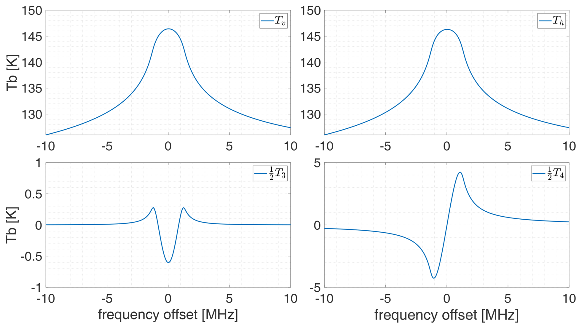 In this equation, λ represents the wavelength and kb is the Boltzmann constant. The characteristic line shapes of the modified Stokes parameters in units of brightness temperature for the oxygen emission line centered at 53.067 GHz are illustrated in Fig. 1. The spectra of the first three Stokes parameters show even symmetry around the line center, while the fourth Stokes component has an odd symmetry. The line shapes depend on the angle of the line of sight relative to the magnetic field lines. For example, the maximum power of the fourth Stokes component is expected to be emitted parallel to the field lines, while it vanishes for emissions in normal direction.