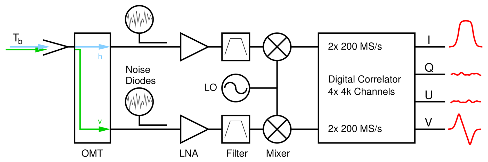 Figure 2Simplified schematic of the TEMPERA-C front- and back-end (Krochin et al., 2022b). The subscripts h and v denote the two pathways for horizontal and vertical polarization. The Stokes vector representation I, Q, U, V is of illustrative purpose. The direct output of the digital correlator has the representation of the modified Stokes vector (Sect. 2).