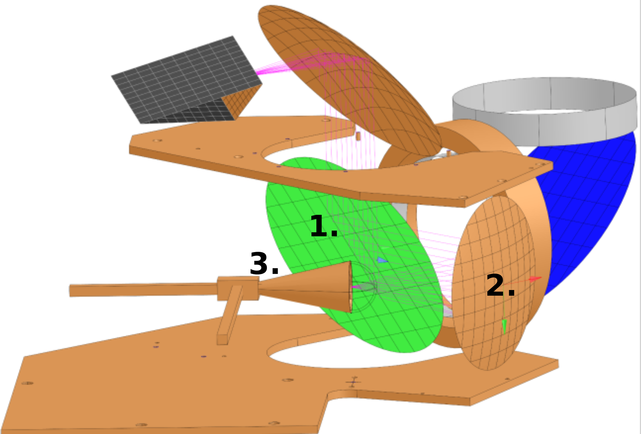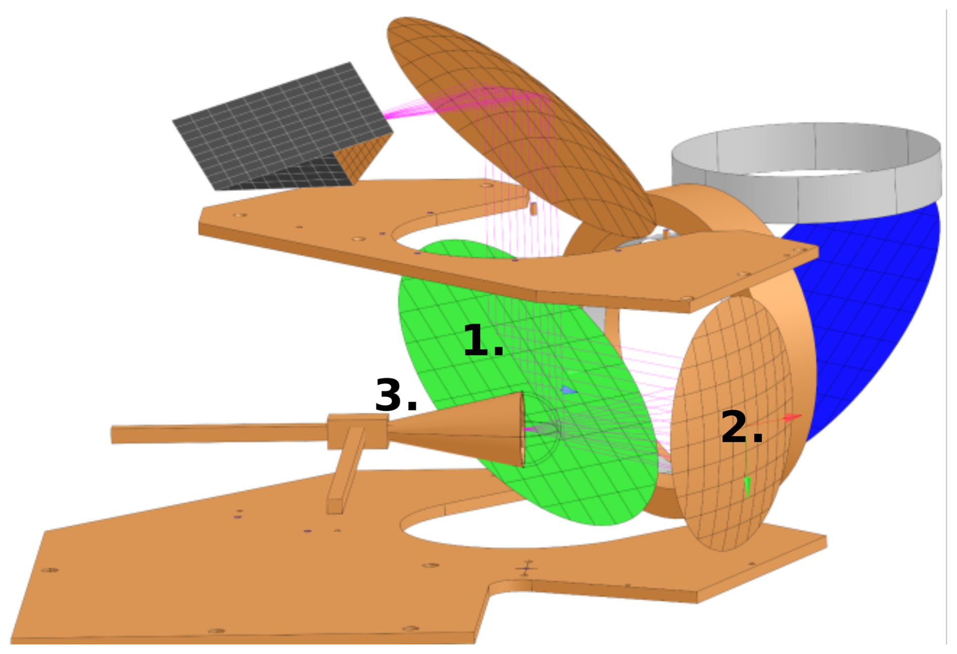The initial results in Krochin et al. (2022b) were obtained with an early prototype of the instrument with simplified optics. In this publication, we show the results obtained with the final optical design. It includes a corrugated feed-horn with an ultra-gaussian antenna pattern and a measured cross-polarization below −40 dB (Fig. 3) and an off-axis parabolic reflector which is designed with a full width half maximum beam width of 3.2° in the far field of the instrument. A rotatable planar mirror is used to switch the direction of the beam between the hot and cold calibration targets and sky direction with an adjustable zenith angle. The rotatable mirror is mounted on a linear translation stage, which is used to change the distance between the receiver and the targets by a quarter wavelength after each calibration cycle in order to mitigate the effect of standing waves. The initial feed-horn design was proposed in McKay et al. (2016) and has been further fine-tuned and adapted to our frequency range. The optics were designed with the commercial software GRASP from Ticra (Fig. 4). For the ambient temperature source, a microwave absorber was placed below the instrument. Another microwave absorber placed in a liquid nitrogen bath acts as a cold target to calibrate the noise diodes.