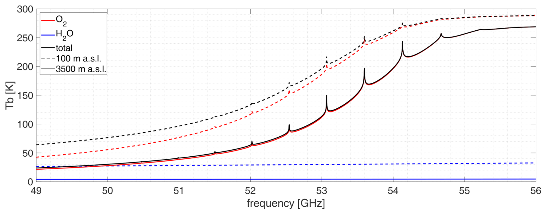 Figure 5Left wing of the 60 GHz oxygen band, simulated for a ground-based sensor at a zenith angle of 30°. Simulations were performed for two sensor altitudes: 100 and 3500 m a.s.l. The influence of air humidity is illustrated by including the H2O emission in the figure.