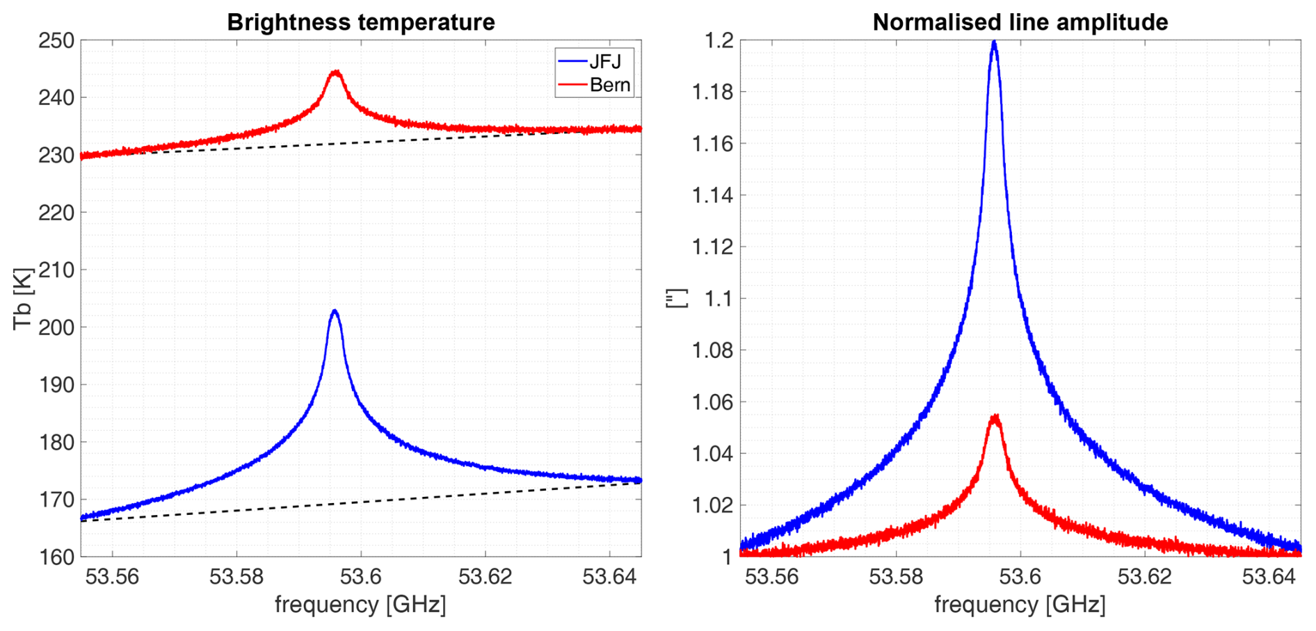Figure 6Comparison of calibrated TEMPERA-C measurements between Bern and the Jungfraujoch high altitude station. The comparison illustrates two measurements of the fine structure emission line at 53.596 GHz in single polarization taken at the Sphinx observatory and at the University of Bern, both during clear sky conditions. The left figure shows the direct comparison after calibration as a solid line, while the contribution from the troposphere (tropospheric background) is depicted as a dashed line. The right figure illustrates the same data normalized by dividing the spectra by the corresponding tropospheric background.