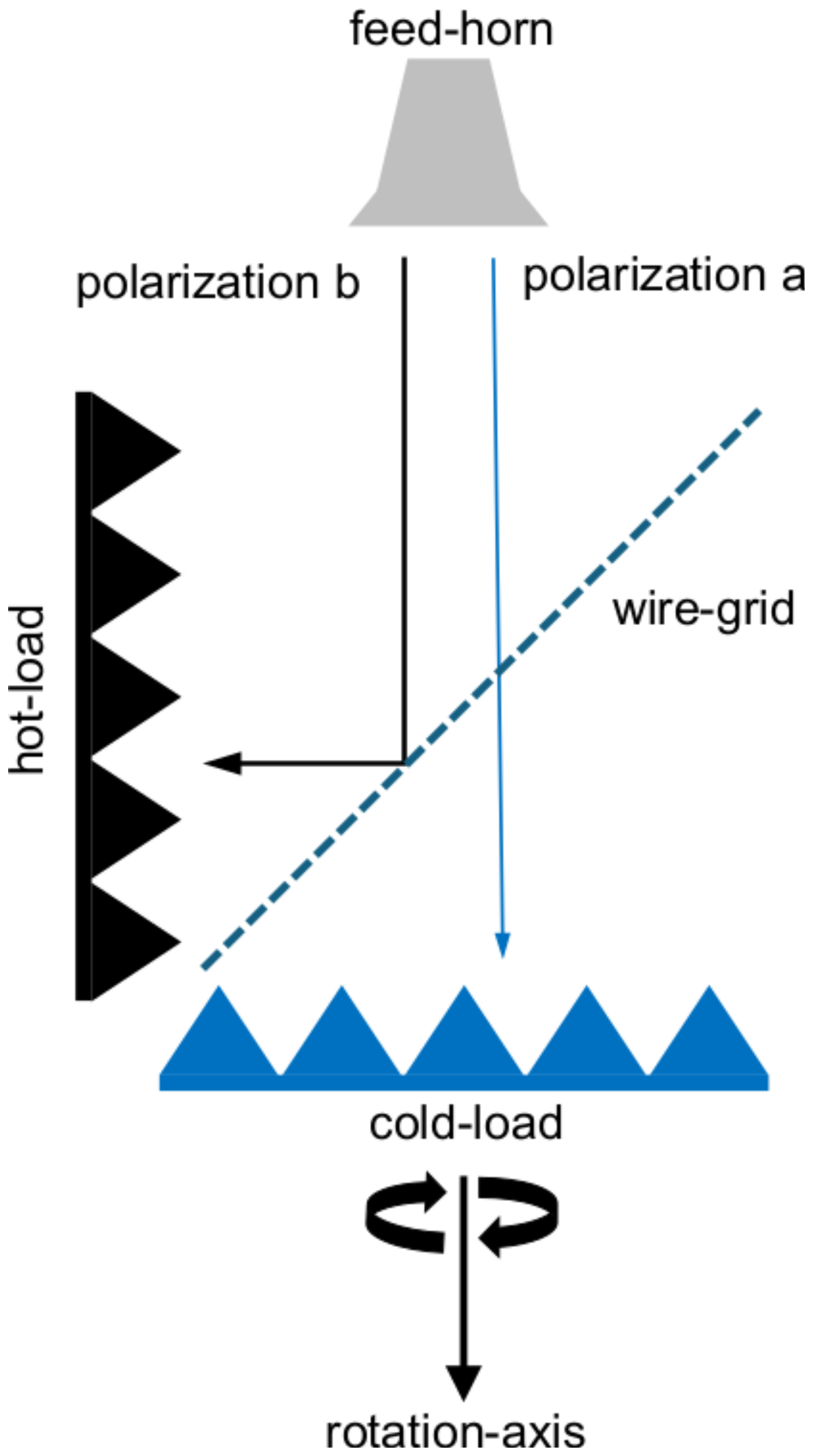 Figure 7Measurement setup according to Gasiewski and Kunkee (1993). The wire grid is positioned at a 45° angle between the hot-load and cold-load. The rotation of the grid by the angle α occurs around the axis indicated by the black straight arrow. The optical paths for the two orthogonally polarized receiver chains, labeled as a and b, are depicted for the case when α=0.