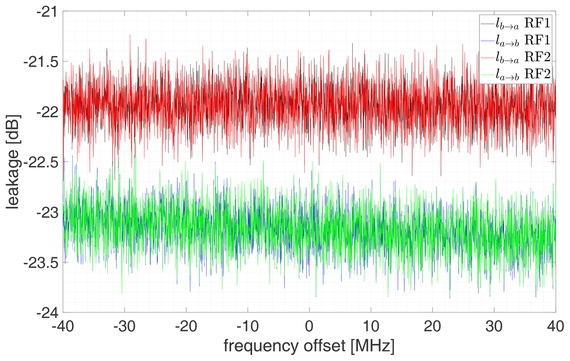 The assumption leading to the Eqs. (19)–(24) can alternatively be formulated as that the cross-talk is generated before the signal enters the LNA. Additional sources of cross-talk contributions are theoretically the path through the LO or inside the digital correlator. We verified the reliability of this assumption by estimating the upper limit for the total cross-leakage between the receiver chains through alternative pathways. This was done by alternately switching on the noise diode in one receiver chain and measuring the reaction in the other one. The measured reaction was below the detection limit, providing confidence that our assumptions are valid for our receiver configuration and components. Figure 8 illustrates an upper limit for the receiver chain leakage calculated with: