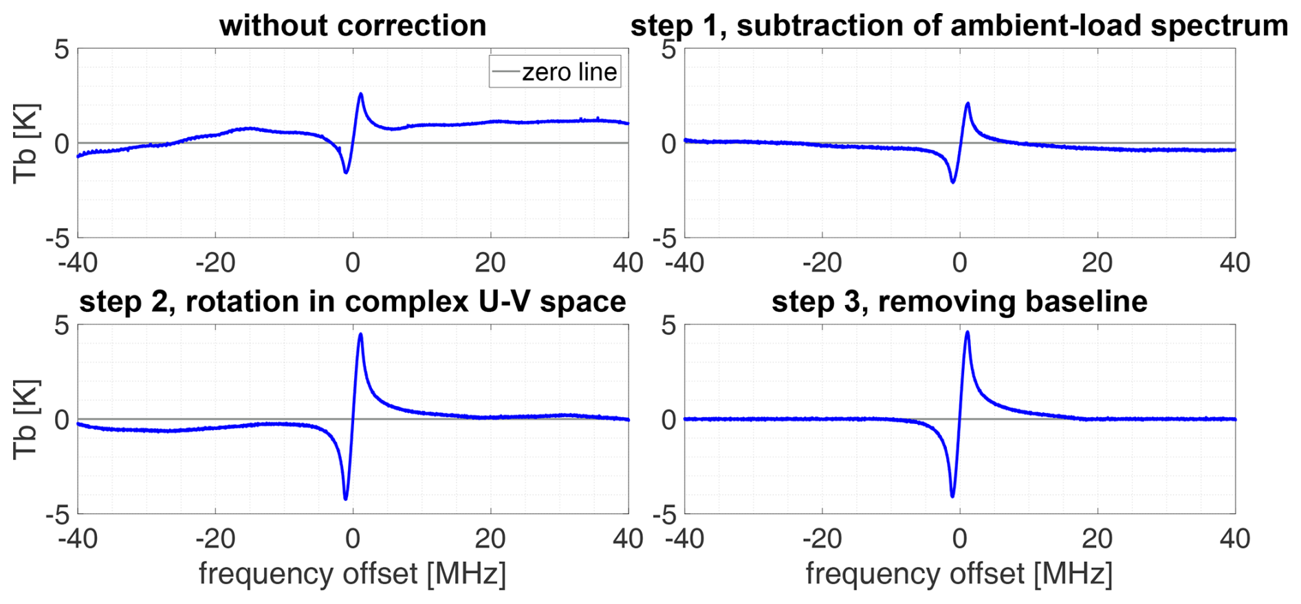 For , the correction equation is analogous. The first term on the right-hand side represents the uncorrected brightness temperature, while the second term is the correction term. The components and were corrected beforehand (Sect. 4.6). The effect of subtracting the correction term is illustrated in Fig. 13. The uncorrected line spectrum shows an asymmetry caused by the contribution of , as this spectrum is antisymmetric around the line center. This asymmetry is eliminated by subtracting the correction term.