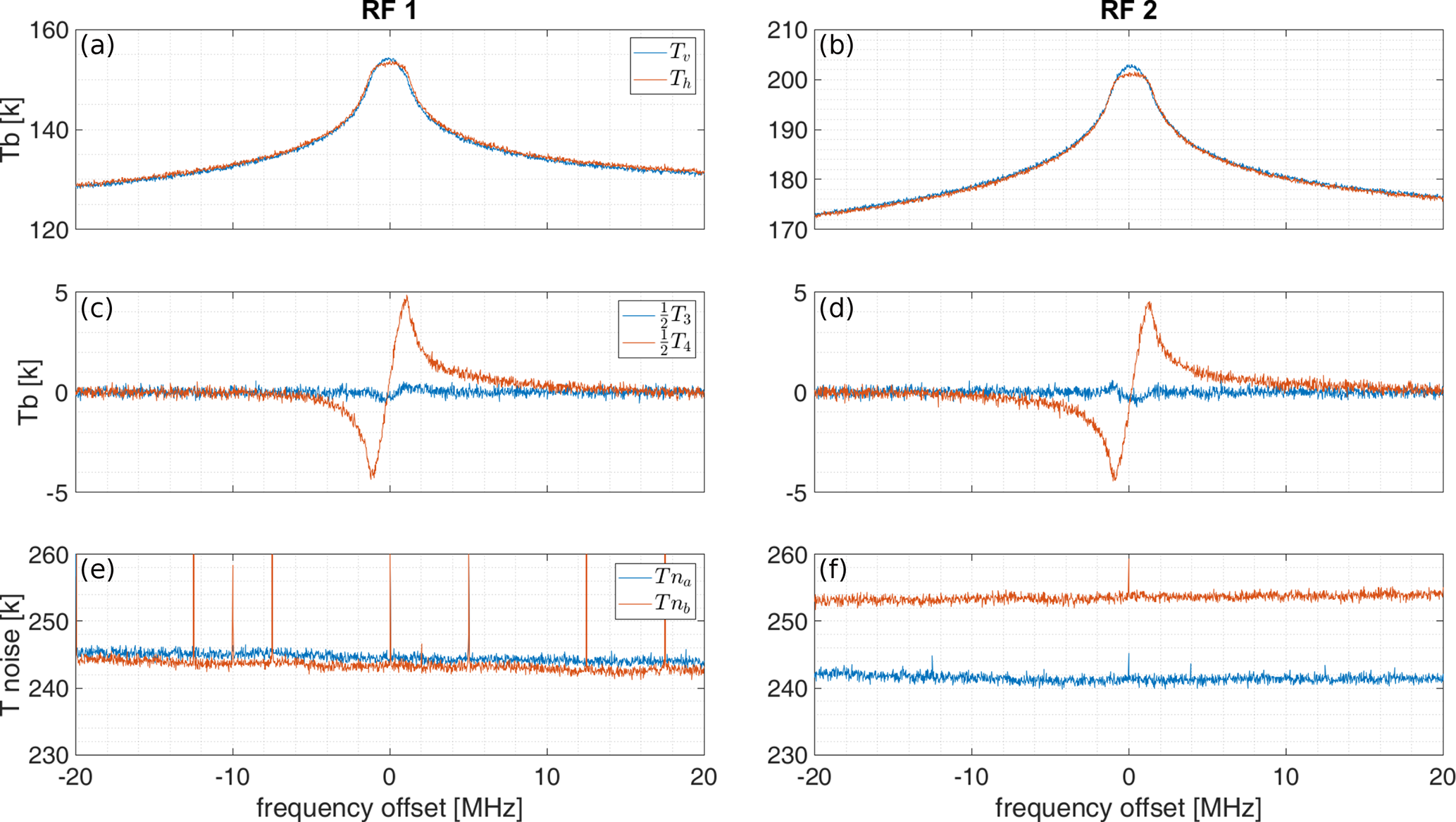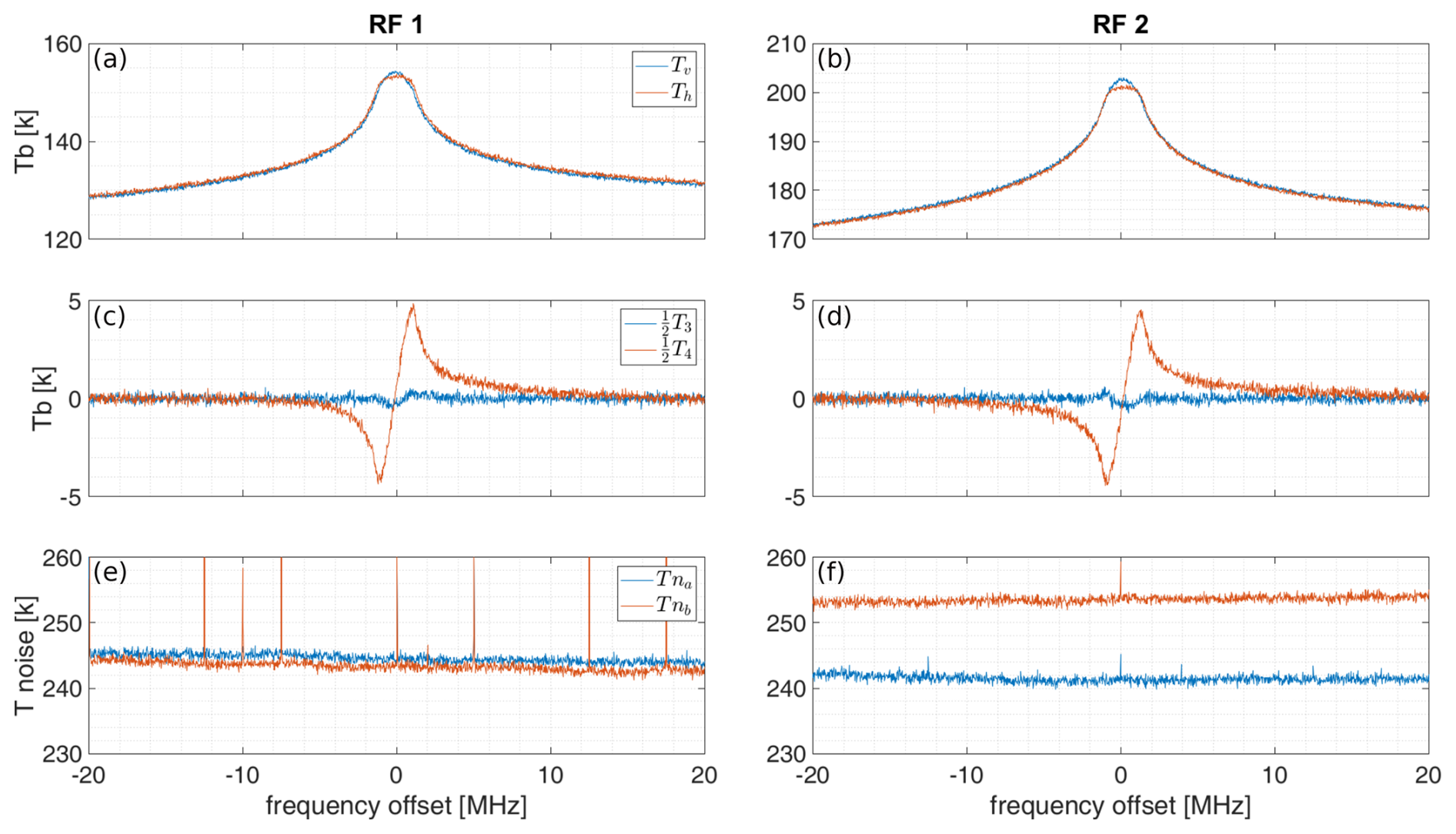 Figure 12TEMPERA-C calibrated and corrected spectra in representation of the modified Stokes vector and instrument noise temperatures measured at the Sphinx observatory. These measurements were taken during nighttime on 25 March 2024, with an integration time of 30 min. Panels (a), (c), (e) display the spectra for the emission line centered at 53.067 GHz, with RF 1 frequency tuned to 53.07 GHz. Panels (b), (d), (f) show the spectra for the emission line centered at 53.596 GHz, with RF 2 frequency tuned to 53.6 GHz.