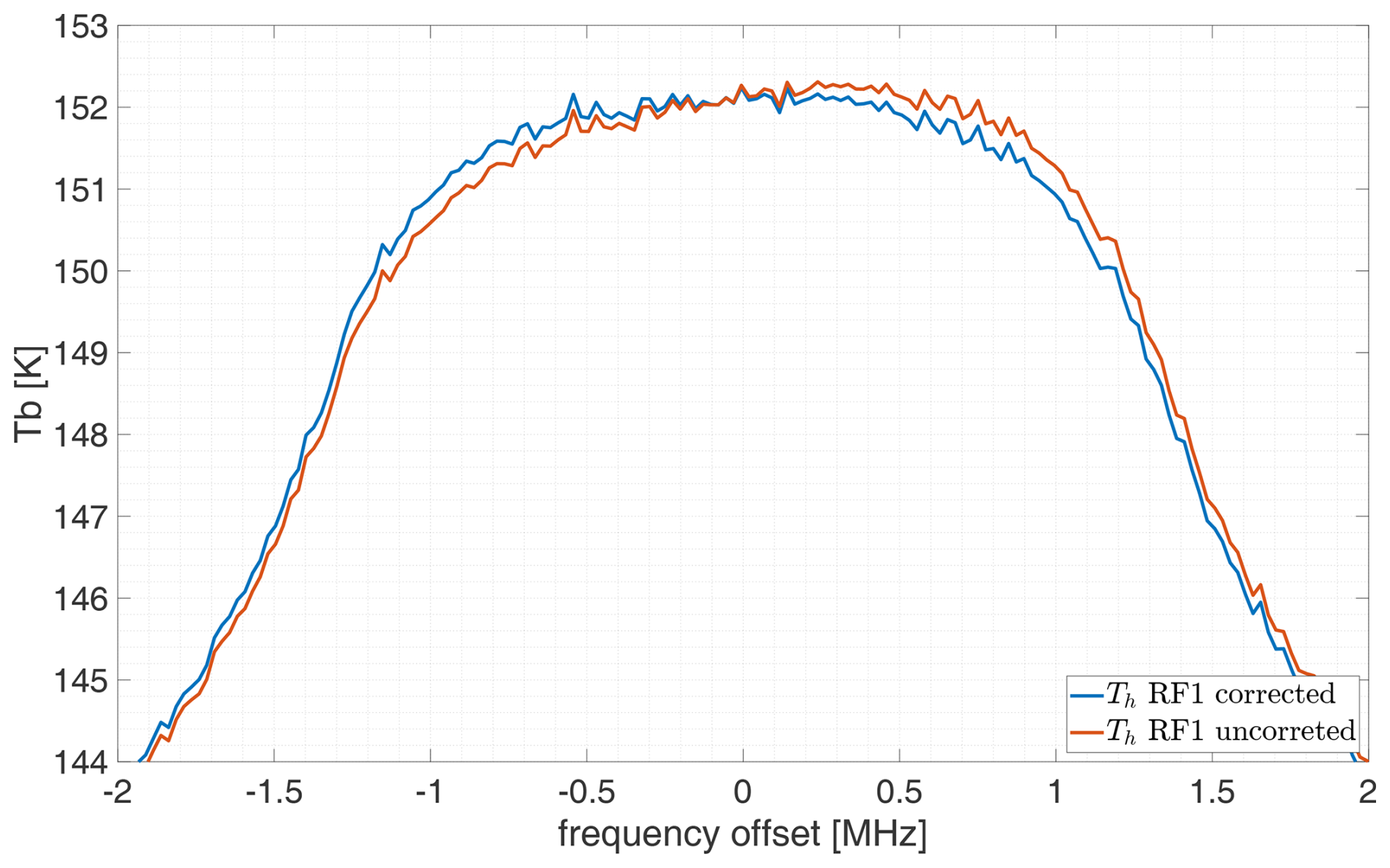 Figure 13Tsky,h before and after the correction according Eq. (54) illustrated for the emission line with centered at 53.067 GHz. The uncorrected line spectrum shows an asymmetry around the line center, which is eliminated after applying the correction.
