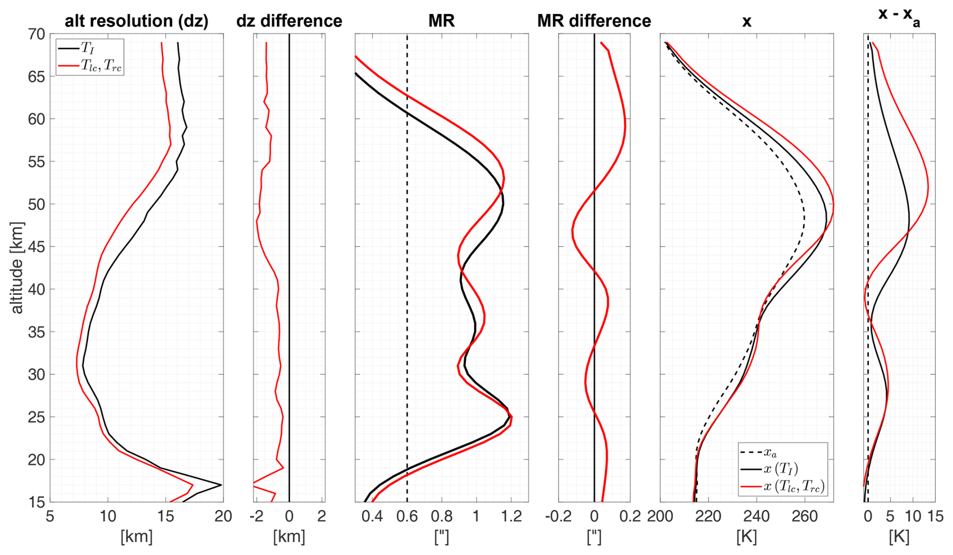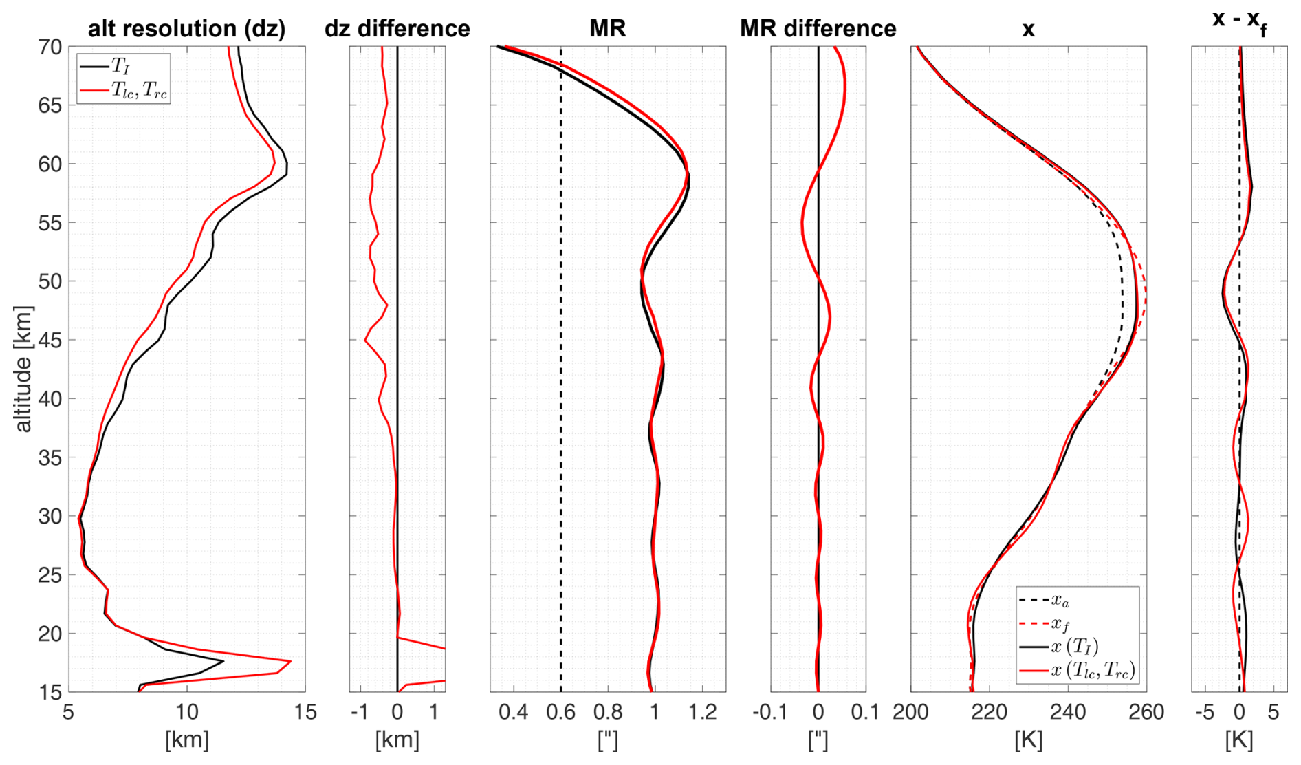 Figure 14Results of the comparison with idealized conditions where the retrieval algorithm was tested with simulated spectra of total intensity TI and dual-circularly-polarized states (Tlc,Trc). The plot illustrates the vertical resolution (dz), measurement response (MR), forward model (xf), a priori (xa), and retrieved temperature profiles (x), along with the corresponding differences between the results for TI and Tlc, Trc.