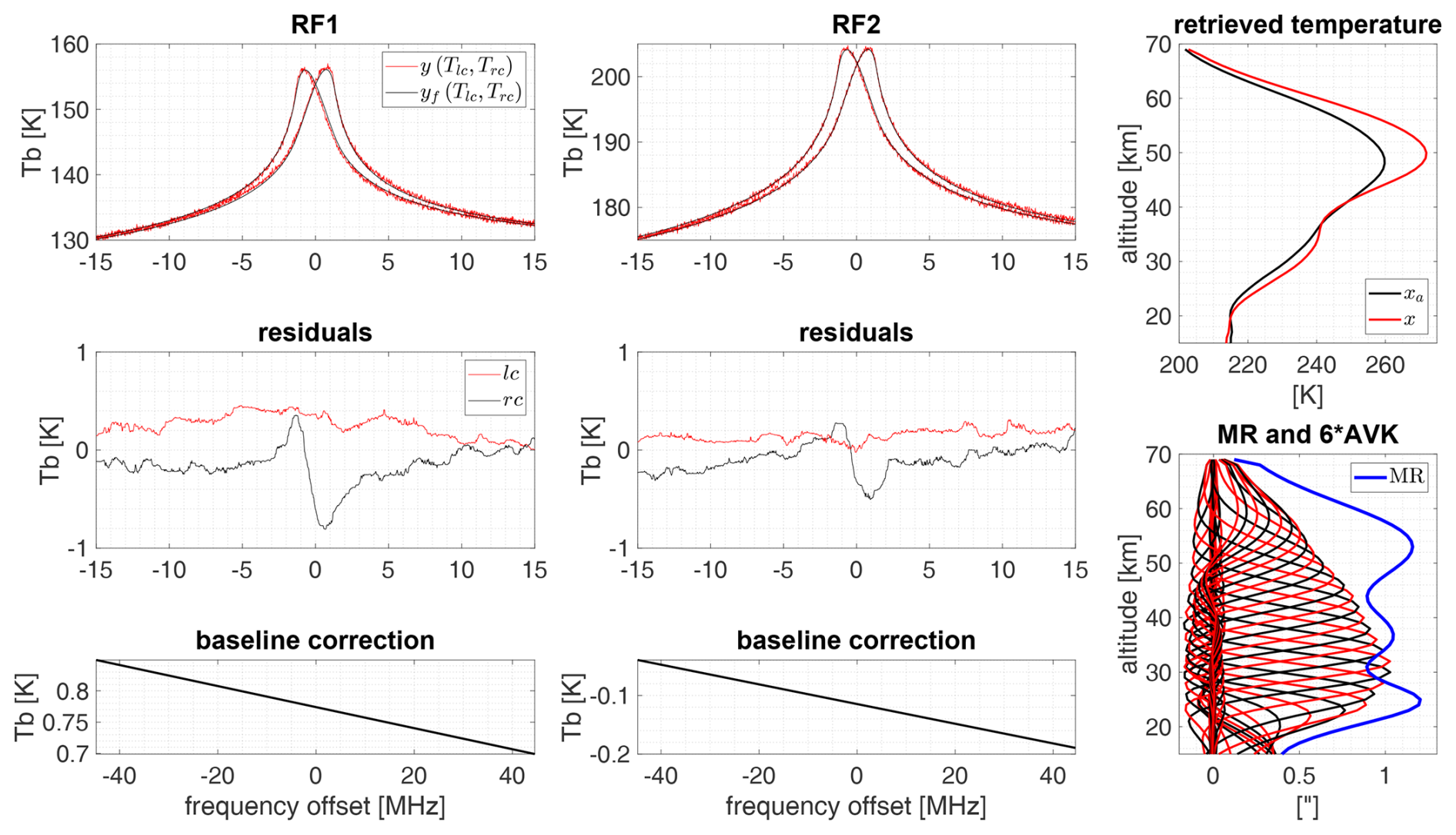 Figure 15Overview of the retrieval result from spectra observed on 25 March 2024, at the Sphinx observatory. Line centers of the RF1 and RF2 spectra are at 53.067 and 53.596 GHz, respectively. The residuals were calculated by and smoothed with a moving window median. For illustrative purposes, every second row of the Averaging Kernel Matrix (AVK) was omitted in the figure, and the remaining rows were multiplied by a factor of 6 to match the Measurement Response (MR).