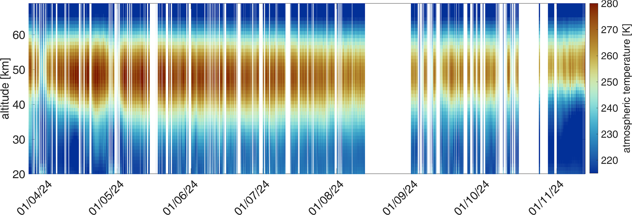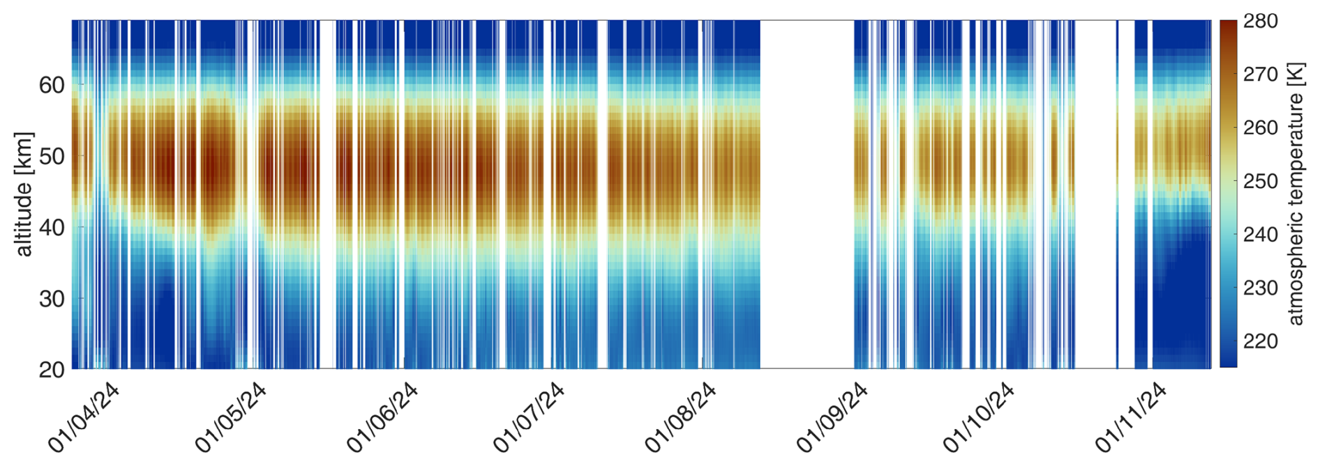 The instrument was deployed as a breadboard to the Sphinx observatory and performed continuous temperature measurements covering the period from 25 March to 12 November 2024. The level 1 dataset contains data gaps due to electricity cut-offs. Additional data gaps in the level 2 data are due to weather conditions. At 3571 m a.s.l., snowfall frequently disturbs the measurements. While during light snowfall, temperature retrievals were occasionally possible, spectra measured during heavy snowfall did not contain enough stratospheric signal to be analyzed. Also, the accumulation of snow and ice particles on the microwave window affected the instrument's performance. We assume that this frost formation and wetting of the microwave transparent window were major causes for disturbed measurements during these weather conditions. During easterly wind conditions, frontal on the window, it was found that the likelihood for disturbances was higher than when the wind came from other directions. Ice particles and snowfall can have different effects on the polarization of the received radiation, which has to be further investigated. Other weather conditions disturbing the measurements were, as usual, heavy cloud coverage and rainfall. The temperature profile time series is illustrated in Fig. 17. Towards the end of August, the LO had reset after a power cut-off and had to be reprogrammed on-site, preventing the collection of data for the rest of the month.
