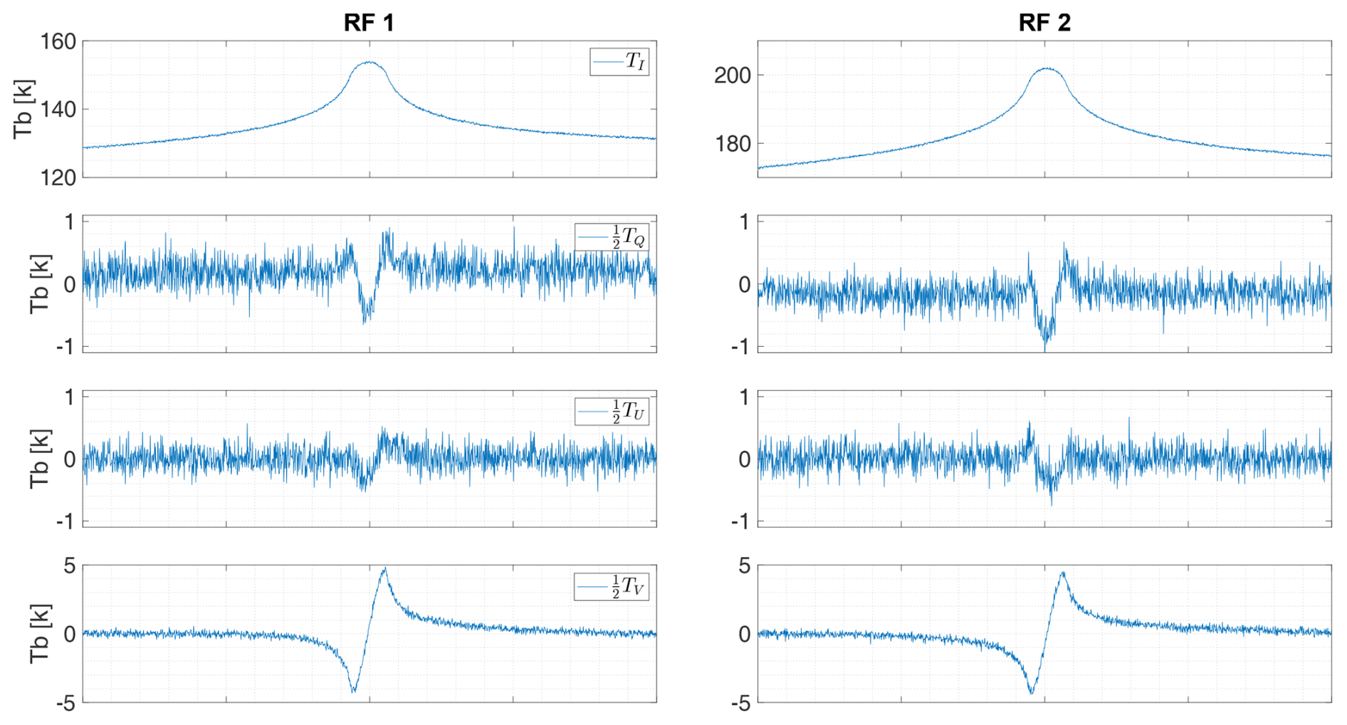 The third and fourth Stokes parameters, also called U- and V-Stokes, represent the difference between the 45° and −45° polarized fields, and between the right-hand and left-hand circularly polarized fields, respectively. For calibration, we will use the modified Stokes vector TB in units of brightness temperature, which is given by: