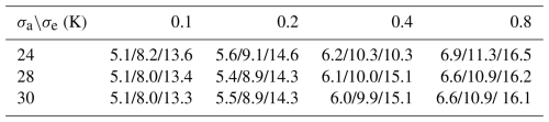 The model is configured in a stratified atmosphere on a 10×10 latitude–longitude grid with the dimensions 0.2°×0.2°. The altitude grid has a spacing of 1 km and extends from 0–70 km. A priori temperature and water vapour profiles are generated using a long-time average of European Centre for Medium-Range Weather Forecasts (ECMWF) profiles. The oxygen volume mixing ratio is set to a constant value of 21 %. The azimuth and zenith angles are 75 and 30° (60° elevation), respectively. The Zeeman broadening effect is implemented for radiative transfer simulations in the middle atmosphere (Larsson et al., 2019; Krochin et al., 2022b). For the Earth's magnetic field, the International Geomagnetic Reference Field (IGRF) model is implemented in ARTS.