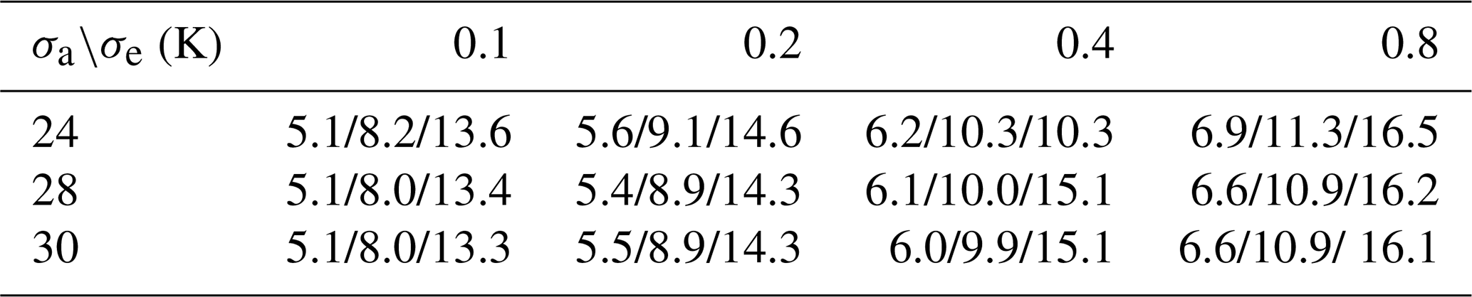 The cross-talk parameters ca,cb were measured once in the laboratory (Sect. 4.4) and are assumed to remain constant. Instrument gain and noise were calibrated on site (Sect. 4.5) with the built-in noise diodes. The noise equivalent differential temperature (NEDT) after 30 min of integration is within the range of for the auto-correlated components and for the cross-correlated components. A bias was found between and , with a magnitude in a range identical to the NEDT. This bias was not constant and frequently changed sign. However, this is not critical for the retrievals, as the combination cancels the bias.