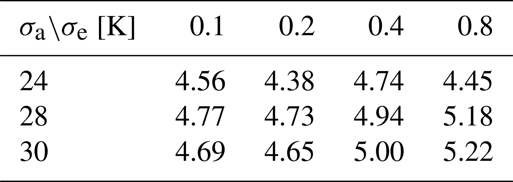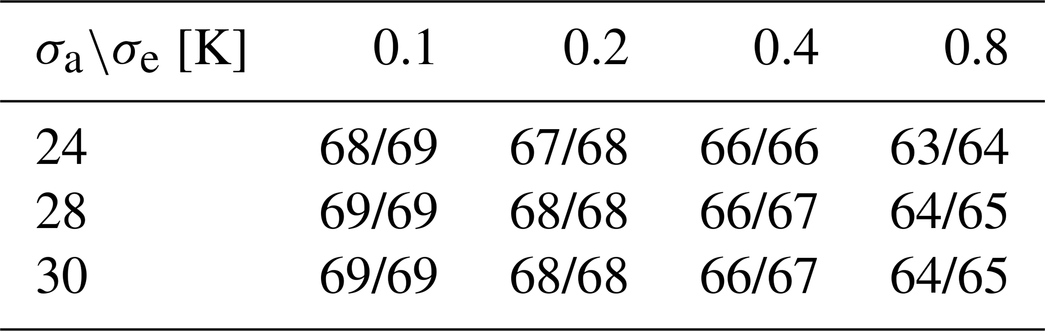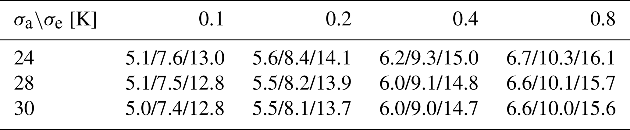 The forward model is simulated using a pencil beam with a rectangular channel response. The instrument noise is treated as an uncorrelated random variable with a normal distribution and a constant mean value for each channel. The measured channel noise ranges from with minor variations between the receiver chains. The apriori covariance matrix Sa contains constant diagonal values for all altitudes. The covariance for off-diagonal elements was calculated with: