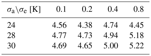 The calibration method presented in this manuscript is primarily based on the methods from Gasiewski and Kunkee (1993) and Lahtinen et al. (2003a). A significant difference is that we use a digital correlator instead of an analog one. This change allows us to reduce the number of independent parameters required for the calibration of the full Stokes vector. The number of calibration parameters can be roughly estimated as follows: an analog correlator typically has four independent detectors, resulting in four gain parameters. If we consider the interactions between the detectors, we introduce 12 additional cross-talk parameters (calculated as 3×4). Along with four offset parameters, this results in 20 independent calibration parameters that need to be estimated. In contrast, our digital correlator processes two independent complex signals from two separate receiver chains, yielding two complex gain parameters and two complex cross-talk parameters. Adding one offset parameter for each of the four outputs results in a total of 12 independent real-valued calibration parameters to estimate (calculated as ).