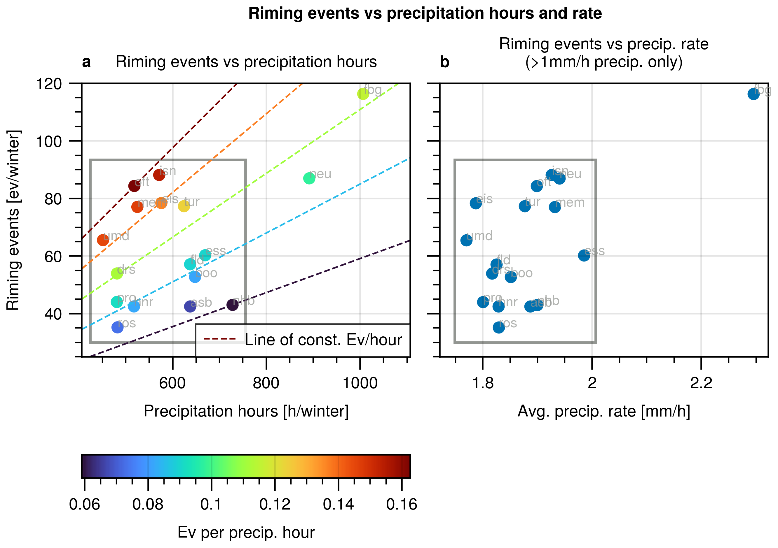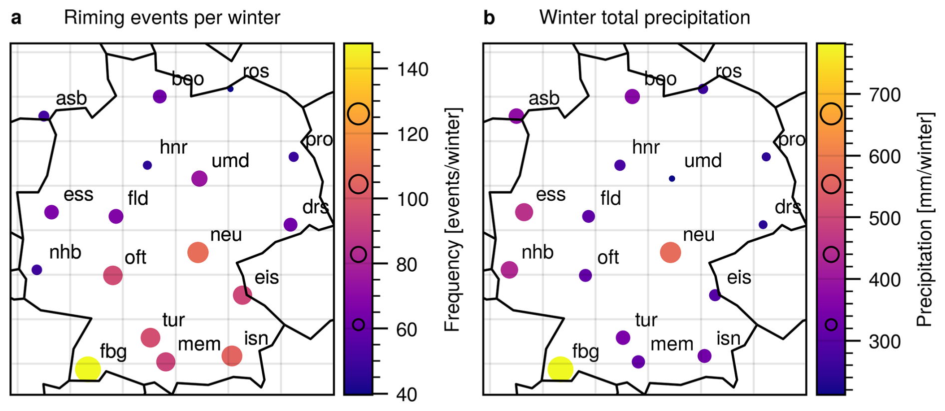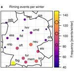3. Differences in riming climatology: There are natural differences in the total number of riming detections between the sites. Those differences will be analyzed in detail in Sect. 3.3. We will correct for them for the temperature analysis in Sect. 3.4.