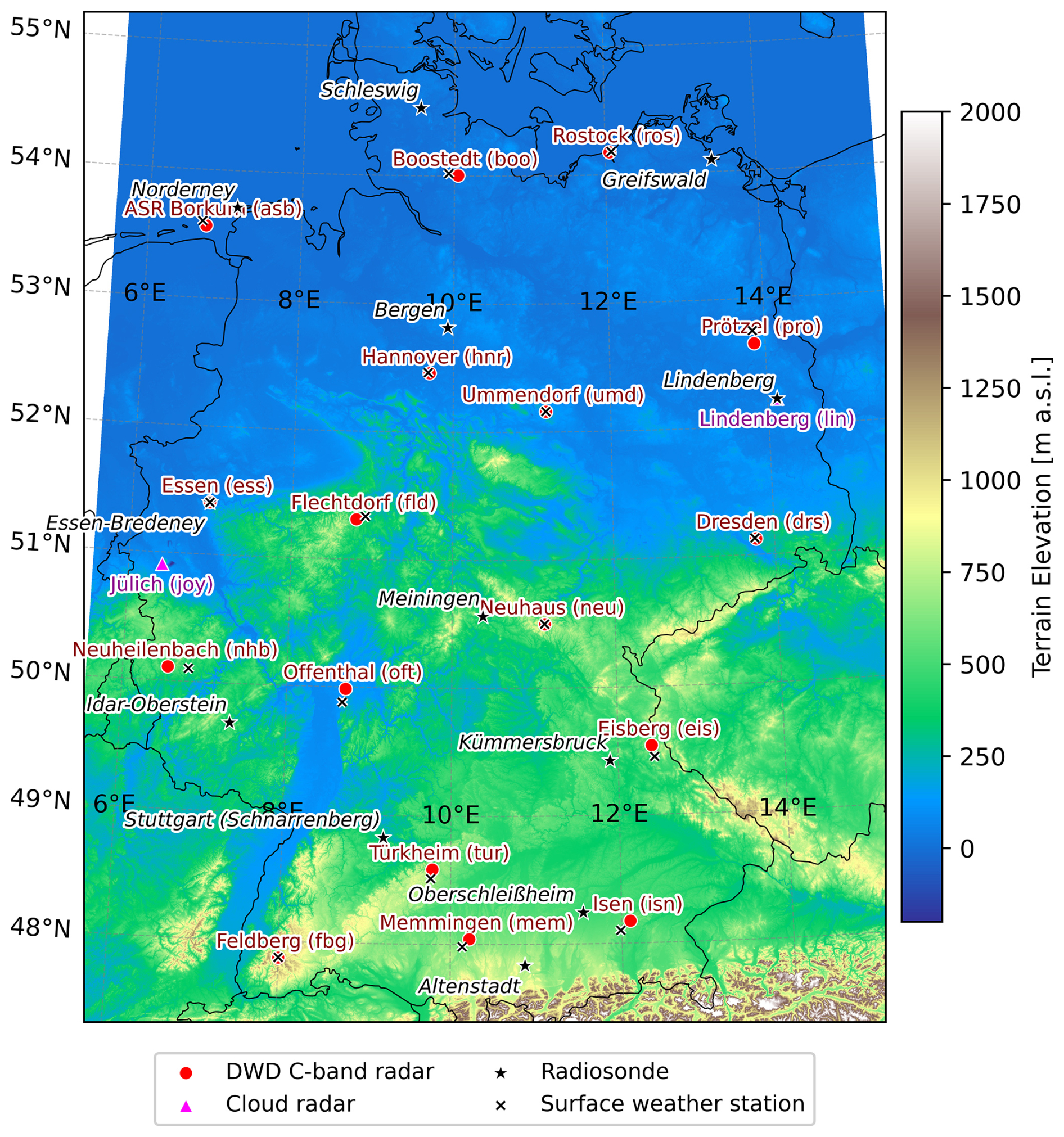 Figure 1Overview map of Germany with locations of all measurement devices used in this publication: the 17 operational C-Band radars, the cloud radars in Lindenberg and Jülich, the sounding stations and the surface weather stations. The abbreviations for the radar sites are given in brackets behind the site name.