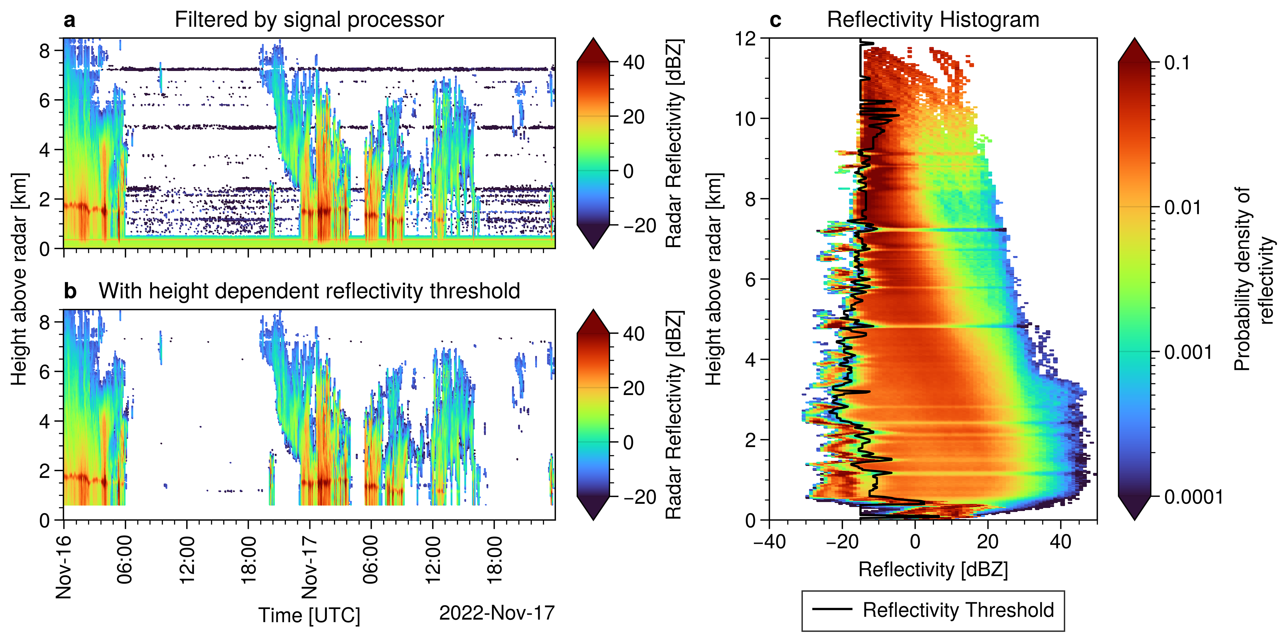 Figure 2(a) Example of a raw measurement at the Essen radar site, with only basic filtering by signal processor. (b) The same scene after clutter filtering, where the clutter is removed based on a height dependent reflectivity threshold. (c) 2D reflectivity by altitude histogram. The clutter lines are visible as horizontal stripes in the histogram. The black line indicates the height dependent reflectivity threshold.