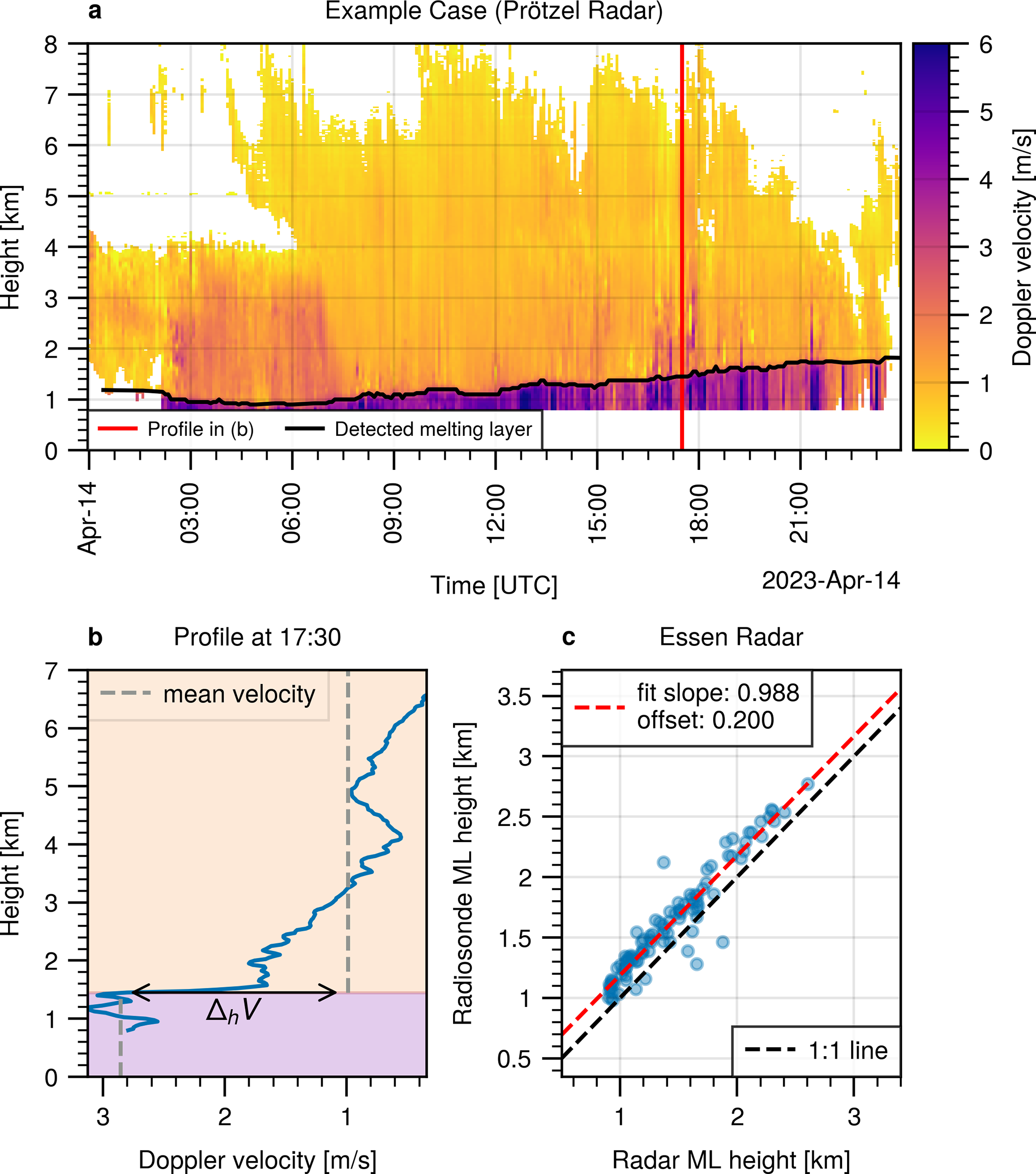 Figure 3(a) Example of a large scale, precipitating system with signatures of riming embedded. The black line denotes the detected melting layer, the red line shows the time of the profile in panel (b). (b) Example of a vertical profile of mean Doppler velocity. The background colors separate the image in two parts, maximizing the difference in average Doppler velocity between the parts. (c) Comparison of the radar derived melting layer with the radiosonde derived melting layer at the Essen radar site. Data for the winter half of the year (November to April).