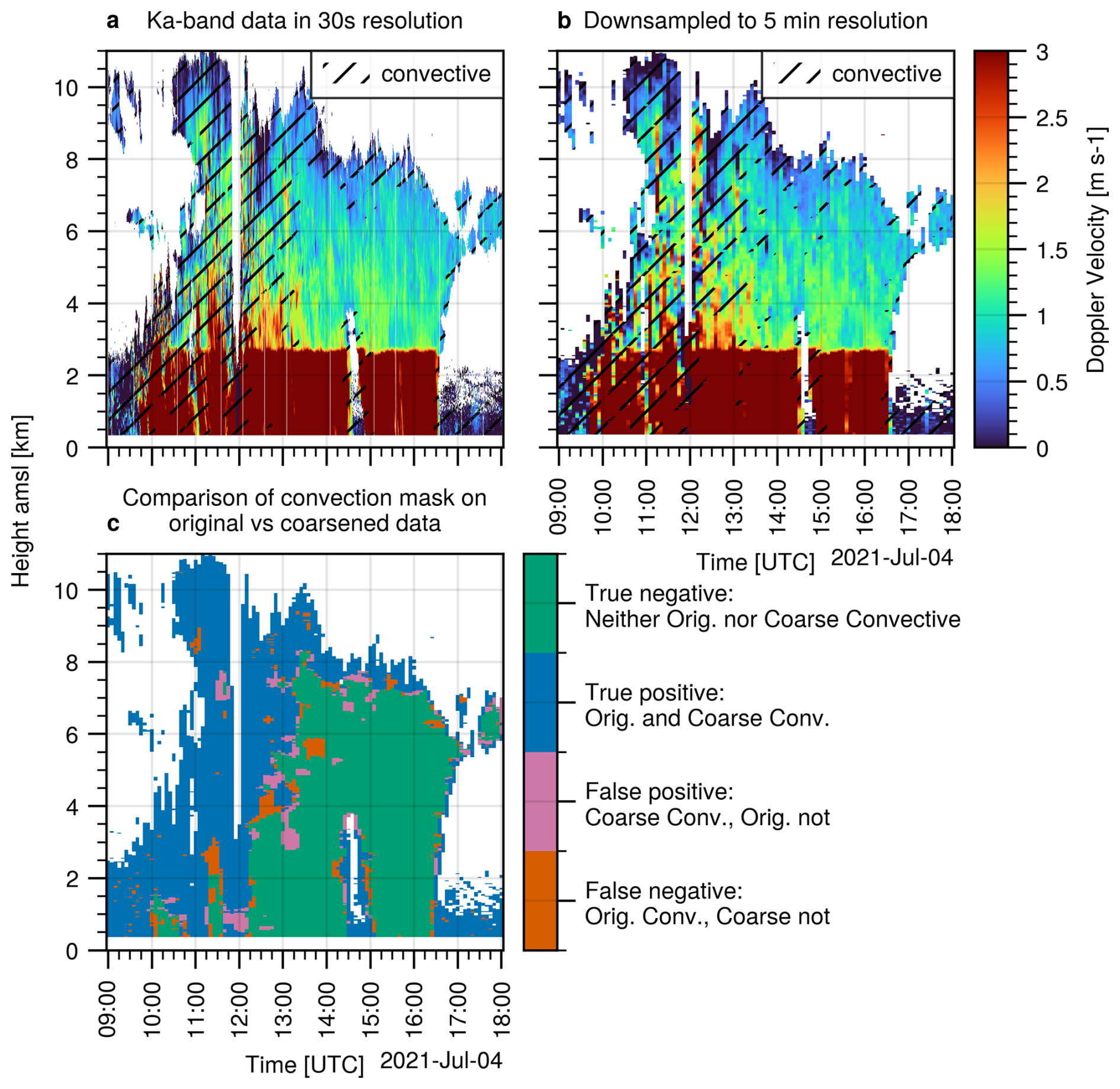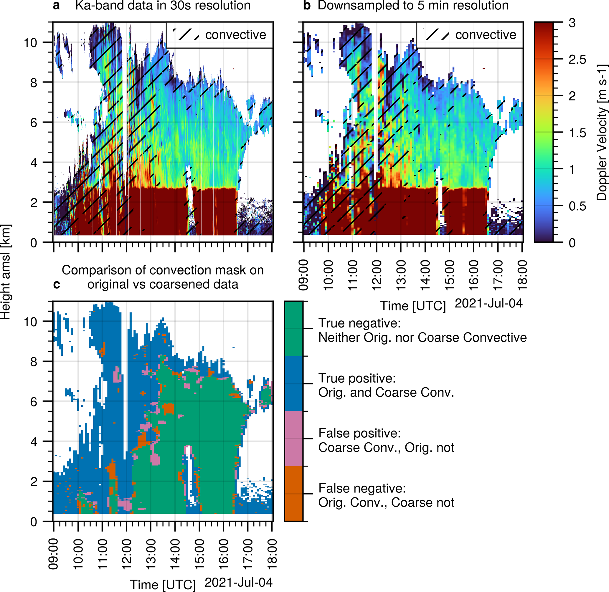 MDV(z) is the average MDV in a ±10 min rolling window. It is assumed that positive MDV indicates downward motion. Mosimann (1995) established 0<κ<0.2 as reasonable thresholds. Values beyond 0.2 are excluded as too convective situations, similarly for values below 0 indicating net upward motion. Kneifel and Moisseev (2020) and Ockenfuß et al. (2025) have confirmed this choice of parameters. However, the validity was only tested for cloud radar data with a sampling rate of 30 s or better, which yields at least 40 samples in a 20 min window. The applicability of this method to C-band radar data with 5 min resolution needs to be proven. Therefore, in Fig. 4, we compare the results of the convection filter applied to a summer precipitation event. Figure 4a is based on cloud radar data in the 30 s resolution of the Cloudnet categorize data, Fig. 4b shows the same event as resampled dataset with 5 min resolution. In the latter case, a 20 min interval contains only 5 values (including the interval edges). Nevertheless the agreement with the original filter is remarkable. In both cases, the filter is able to separate the convective beginning of the precipitation system from the stratiform trailing precipitation well. In a postprocessing step, we smooth the new filter results by removing small non-convective patches in large convective regions and vice versa. Figure 4c directly compares the two filter masks, revealing an agreement of 92 %. We also systematically tested different window sizes between 10 and 40 min and different upper κ thresholds between 0.1 and 0.4, but found the best agreement (i.e. highest overlap) by keeping the original (20 min and 0.2) parameters.