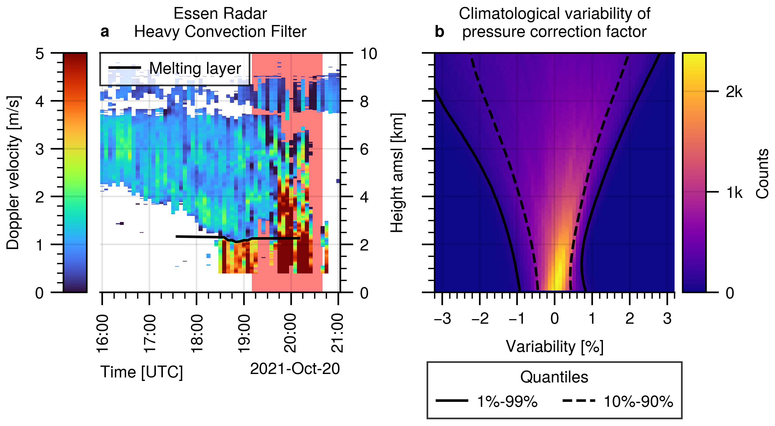 Figure 5(a) Example of a convective event at the Essen radar site. The red time interval is excluded from any analysis due to the high reflectivites in the liquid part and the high Doppler velocities in the ice part of the cloud. The black line shows the extrapolated melting layer, detected by the method described in Sect. 2.5. (b) Relative variability of the pressure correction factor due to natural pressure variability.