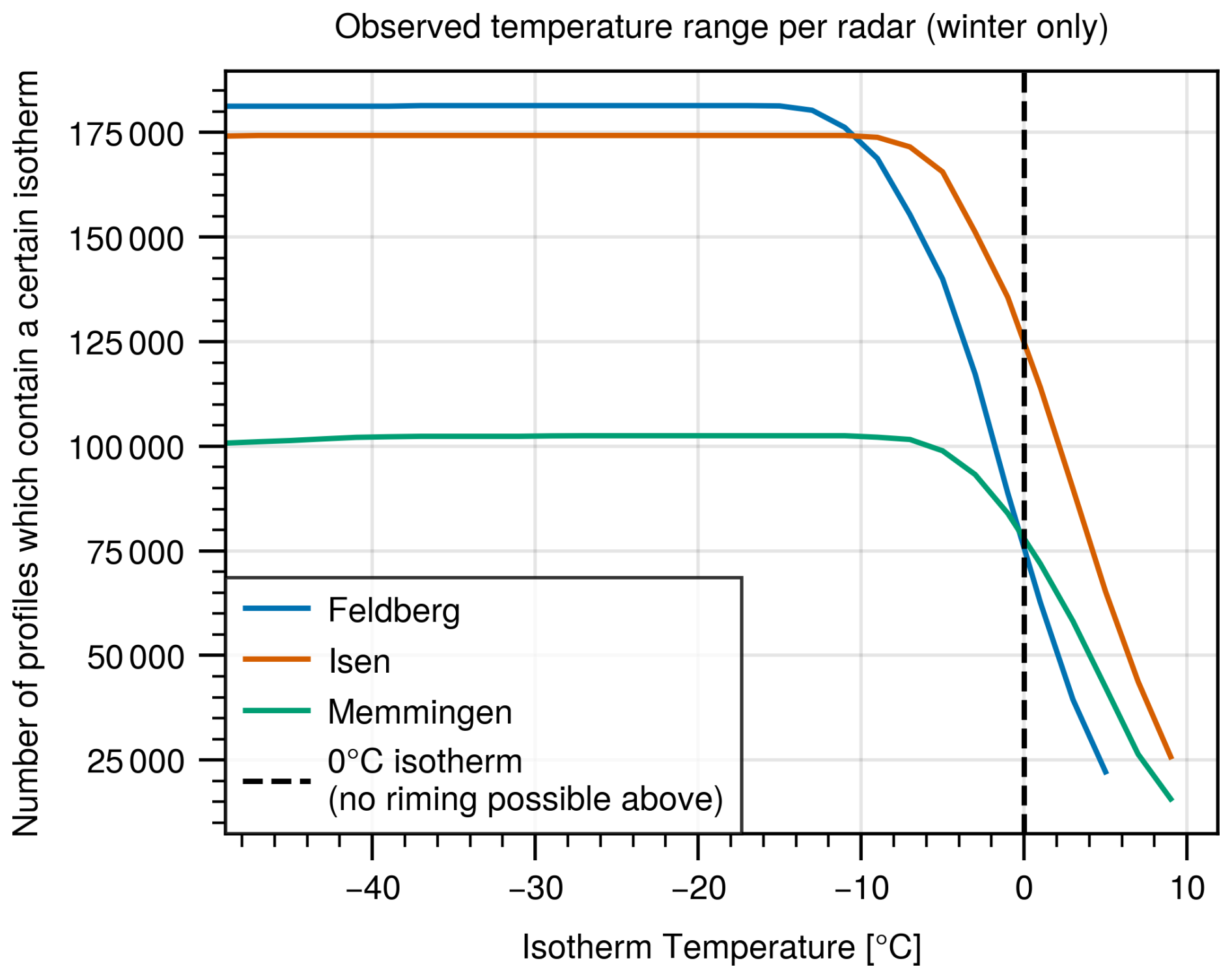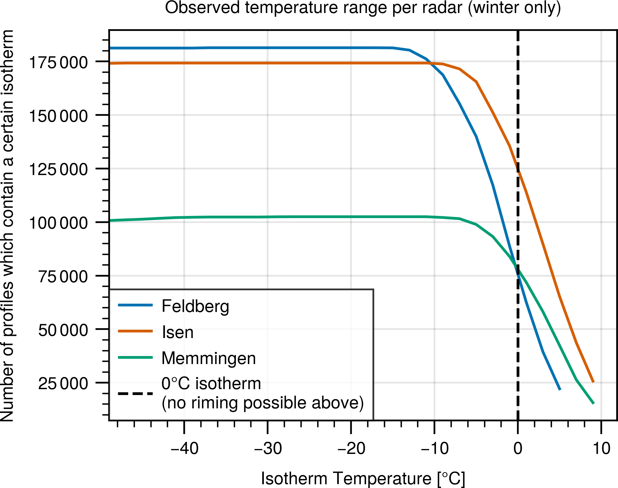 In order to correct for the points above, we count how often a certain isotherm is observable for each radar, taking into account the radar elevation and blind range. The isotherm information is again taken from the closest radiosonde to each radar site. We require less than 12 h difference between radar and radiosonde observations. Figure 6 shows an example of the number of observations per isotherm for the Feldberg, Memmingen and Isen sites during winter (November to April). We clearly see that the Memmingen radar had a longer maintenance period and therefore less observations in total. We also see that the Feldberg radar is located at a higher elevation and therefore, there are less observations at warmer temperatures compared to the Isen radar. For the results in Sect. 3.4, we divide the absolute number of riming detections per radar and temperature level by the curves in Fig. 6. This corrects for the points 1 and 2. Then, normalizing the resulting distributions to have an area of one under the curve corrects for point 3.