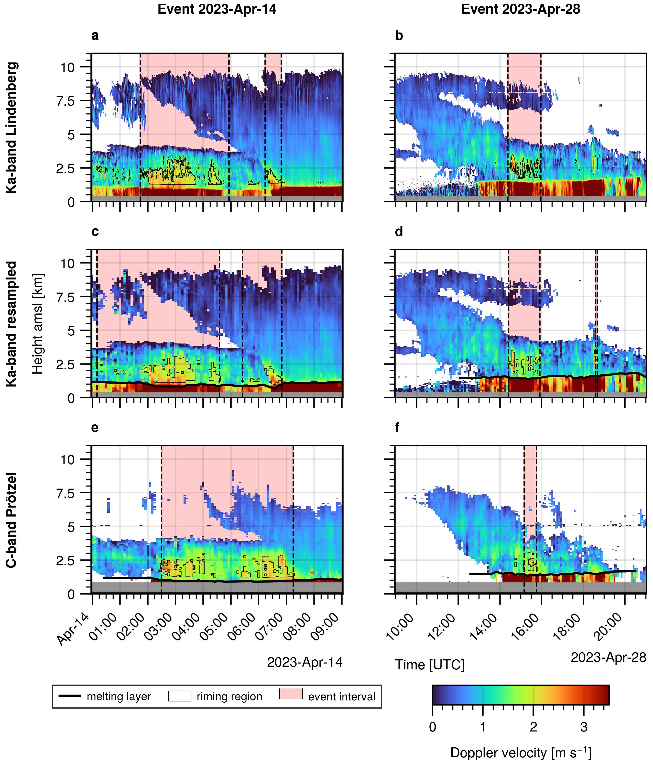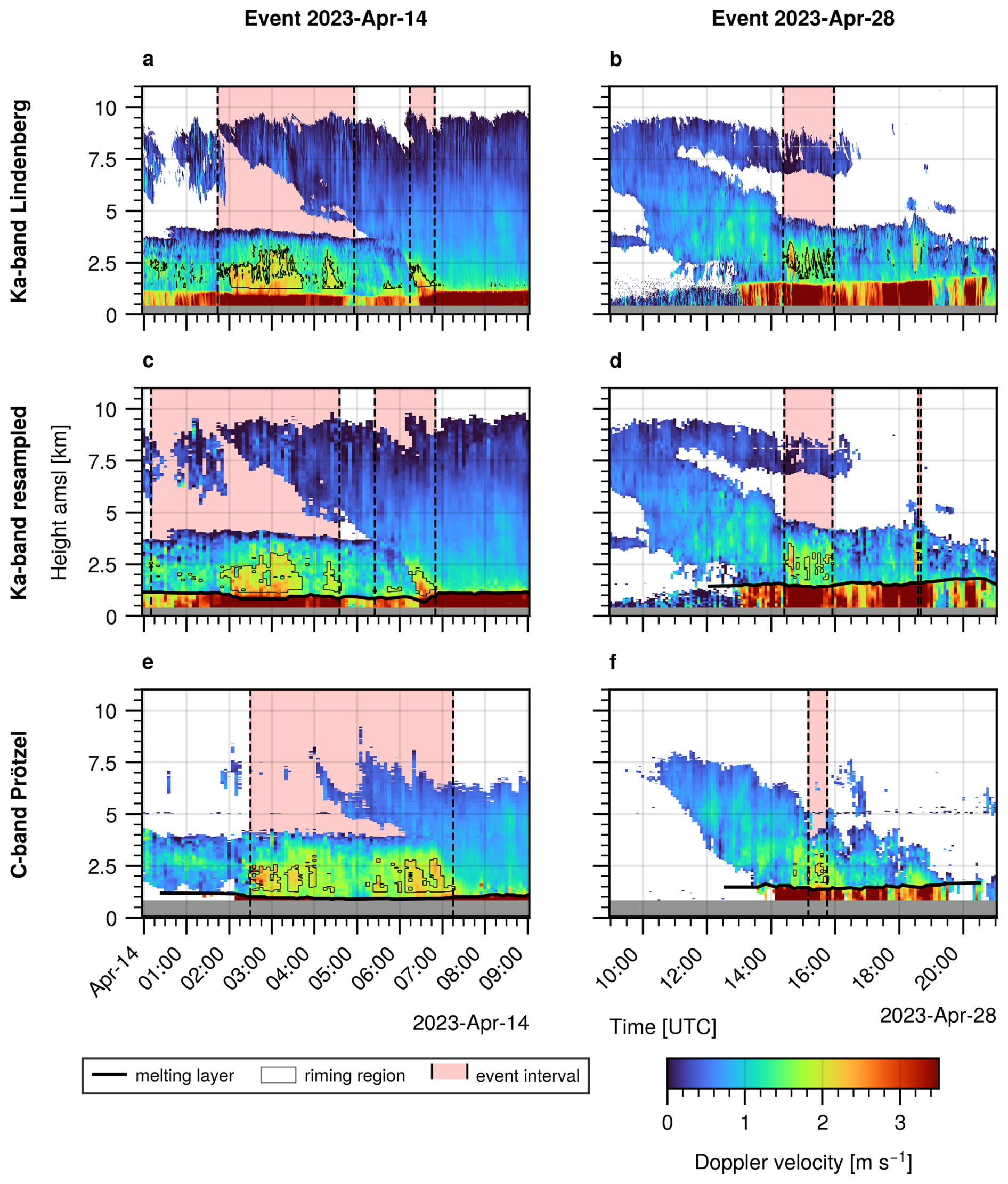 Figure 7Examples of two events with riming signatures. Left column: 14 April 2023. Right column: 28 April 2023. (a, b) Observations by the Lindenberg cloud radar in 30 s resolution, with riming regions detected by the benchmark retrieval. (c, d) Resampled Ka-band radar data in 5 min resolution, based on the data from row one. Riming regions detected by the retrieval on the resampled dataset. (e, f) C-band radar data in 5 min resolution from the Prötzel radar site. Riming regions detected by the operational retrieval.