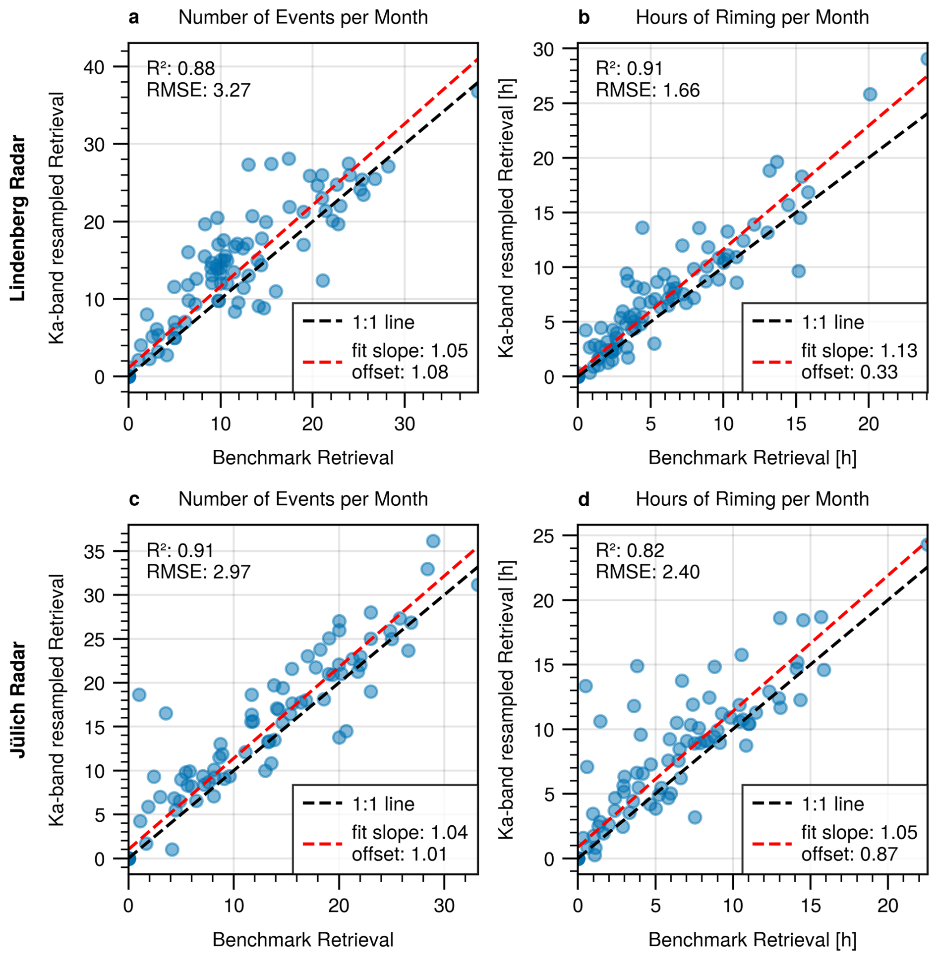 Figure 8 compares the benchmark and resampled retrieval statistically with respect to the monthly number of events (Fig. 8a, c) and the monthly duration (Fig. 8b, d). We see that the resampled retrieval can produce slightly different results for some months, but the overall correlation between both retrievals is good for both investigated sites. On average, the resampled retrieval seems to detect a little bit more/longer riming events per month, as is evident from the red fit line being above the black 1:1 line. From manual inspection, we found multiple reasons for this: Sometimes, as for example in Fig. 7a and c or Fig. 7b and d, the clustering can be different. In some other cases, the retrieved melting layer can be too low, causing rare false positives due to rain being classified as riming. Overall, we conclude that the changes we introduced in resolution, filtering and melting layer retrieval (see Table 1) should not bias riming statistics significantly.