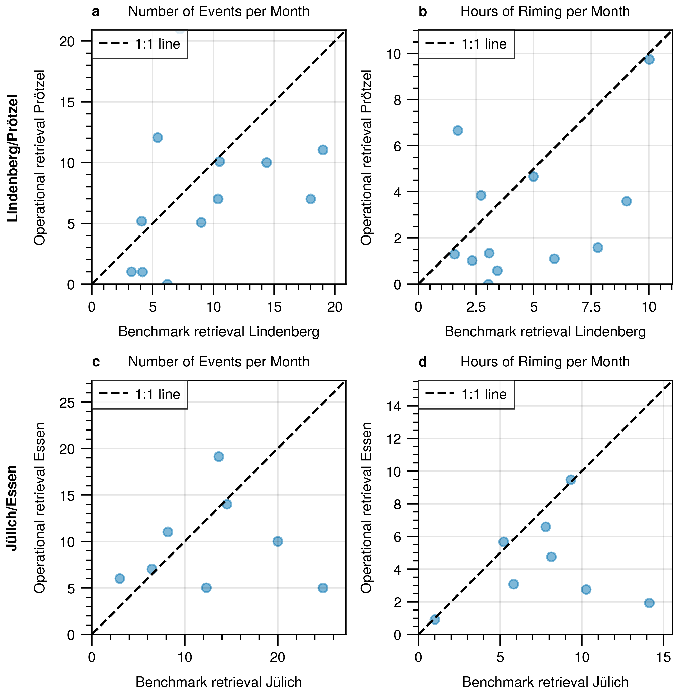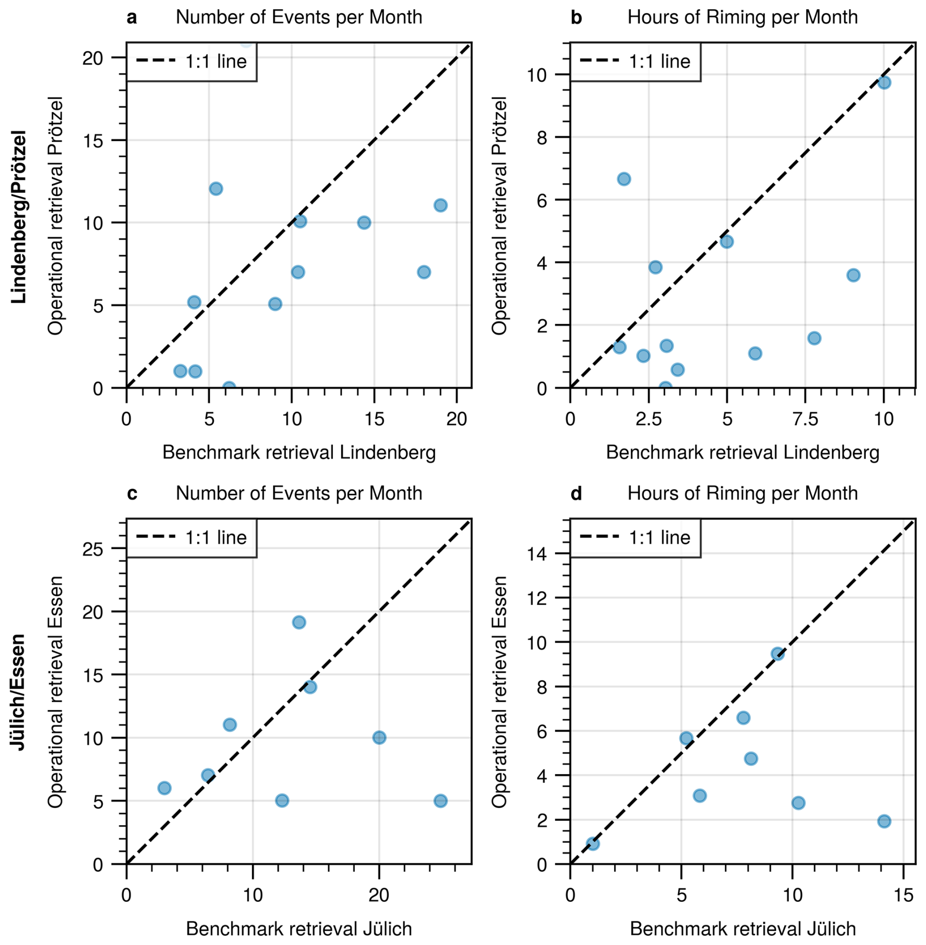 Figure 9(a) Monthly number of riming events detected by the Lindenberg benchmark and Prötzel operational retrieval. (b) Same as (a), but for the total monthly duration of riming. (c) Same as (a), but for Jülich and Essen. (d) Same as (b), but for Jülich and Essen. The different number of samples between (a, b) and (c, d) is due to differences in radar uptime.