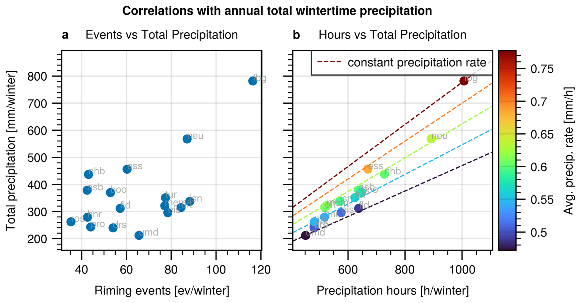 Our analysis of the results reveal a remarkably consistent temperature dependence of riming events across all sites, reinforcing results from previous studies that strong riming is confined to temperatures warmer than −15 °C. Moreover, we find a climatological link between the frequency of riming and both the total amount and intensity of precipitation, supporting a physically plausible connection between riming and enhanced precipitation rates.