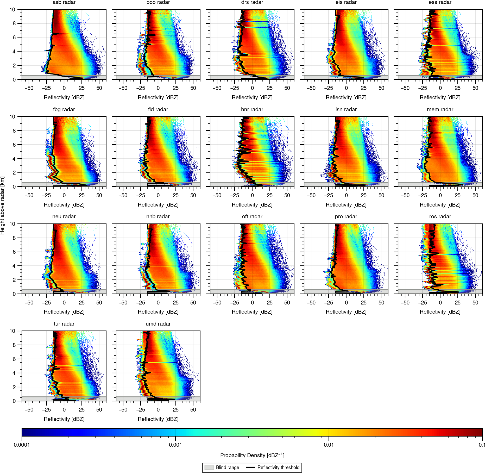 Figure A1 shows the vertically resolved reflectivity histograms and the derived signal-clutter threshold for all 17 radar sites.